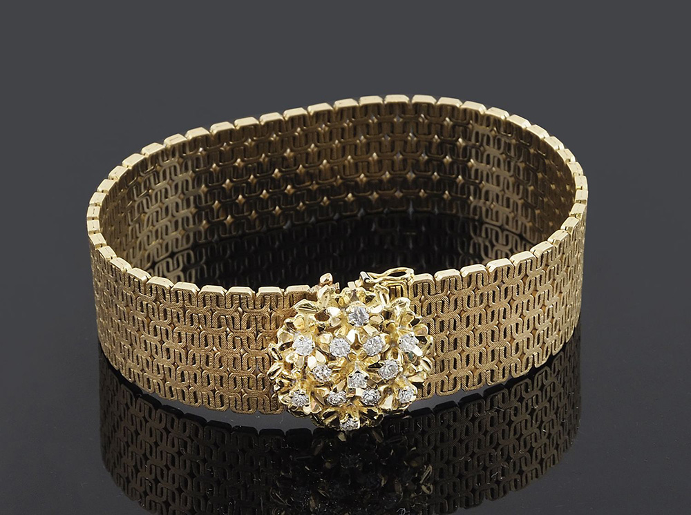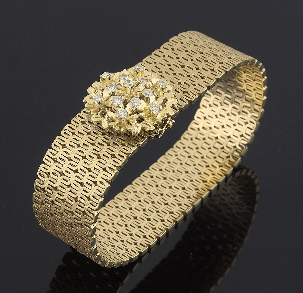 Bracciale a maglia larga in oro giallo con chiusura floreali ricoperta da brillanti. Gr. 74.