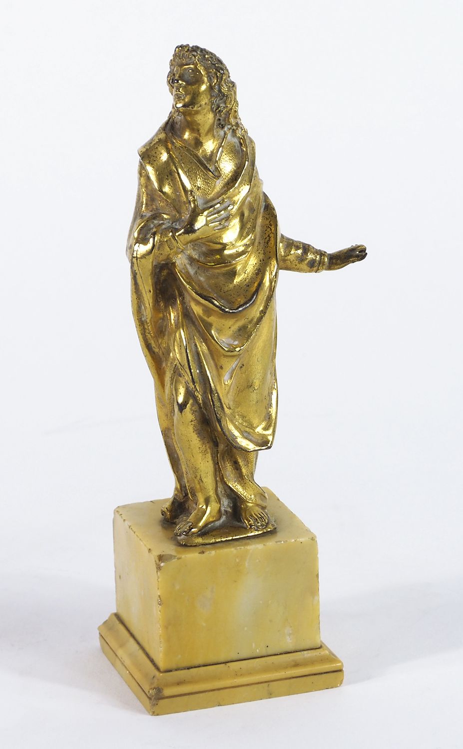 Scultura in bronzo dorato raffigurante Apostolo, su base in marmo. H. tot cm. 20. Prov.: collezione Basilio Trieste.