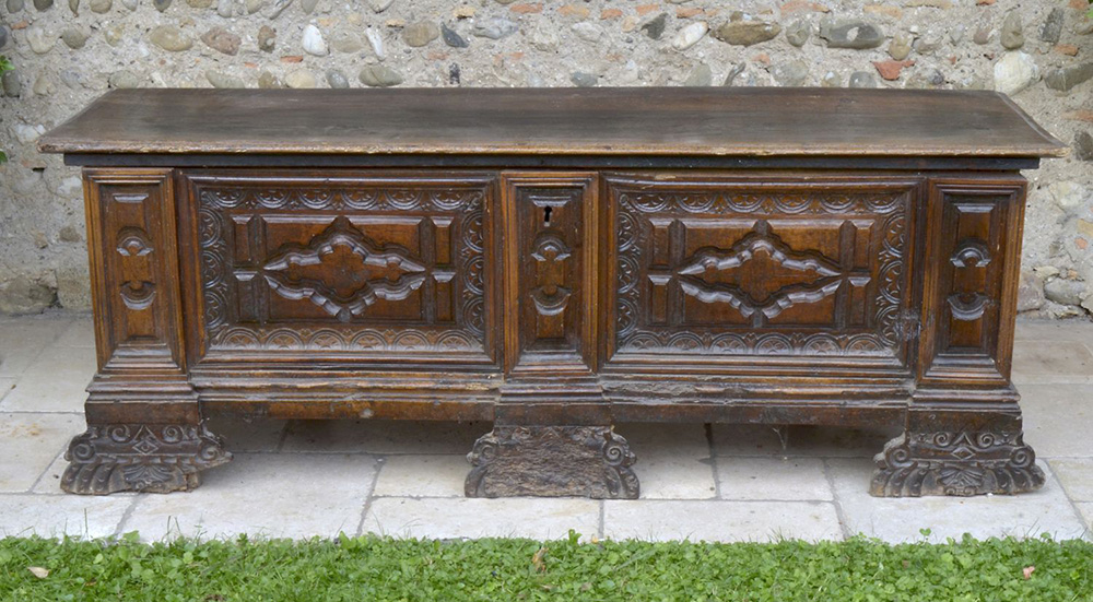 Cassapanca in legno di noce con fronte finemente intagliato, piedi a mensola con volute. Friuli, XVII secolo. cm. 62x174x53. Prov.: Villa Gorgo di Nogaredo di San Vito al Torre (UD).