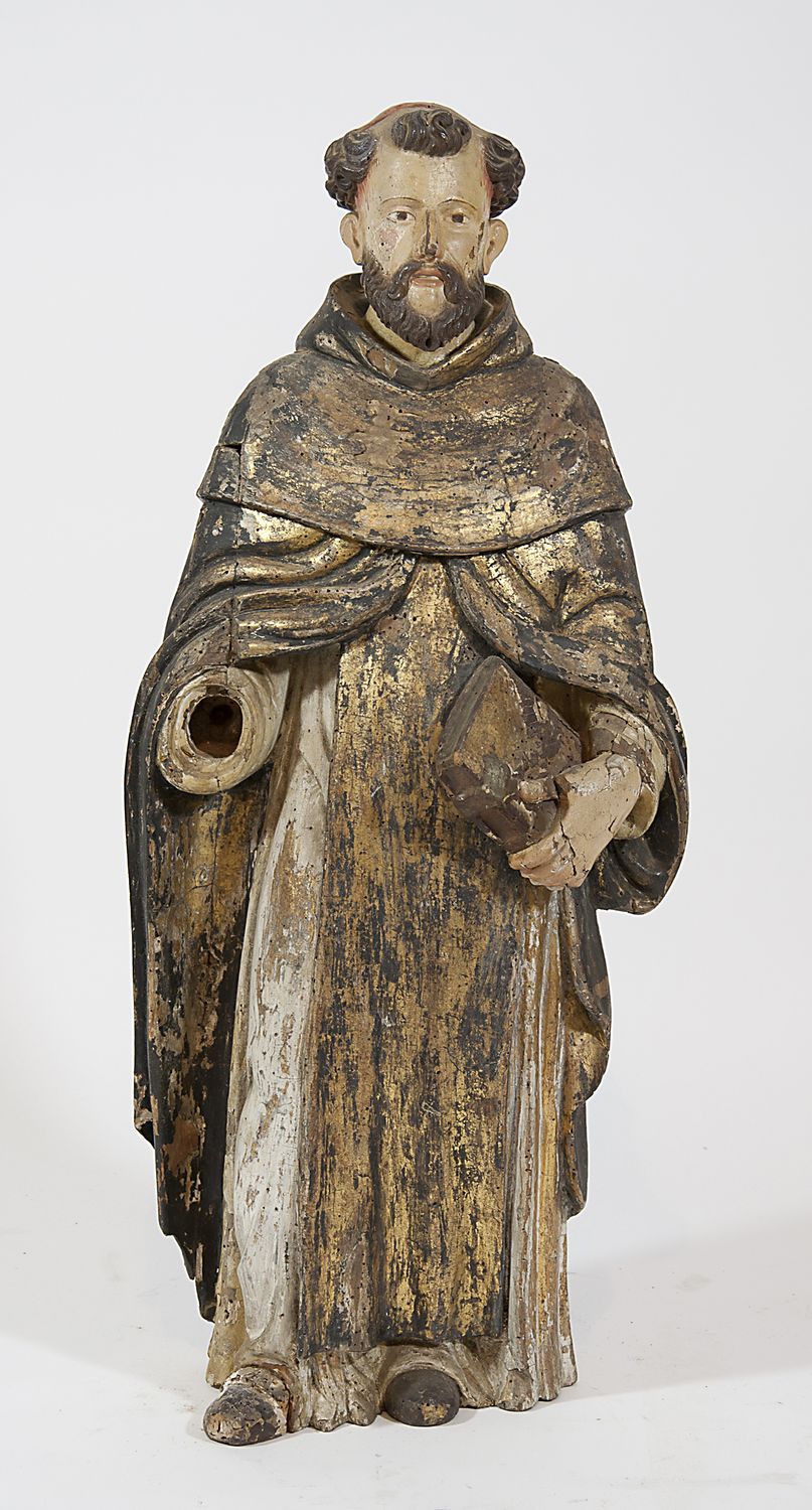 Scultura lignea policroma raffigurante San Pietro da Verona. Veneto, XVII secolo. H. cm. 95. (mancanze).
