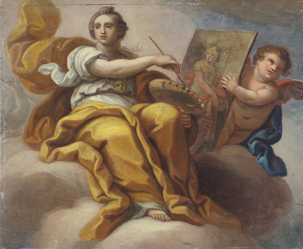 Maestro romano del XVIII secolo Lotto di 2 oli su tavola, cm. 51x61 e cm. 56x52: a) "Allegoria della scultura" b) "Allegoria della pittura"
