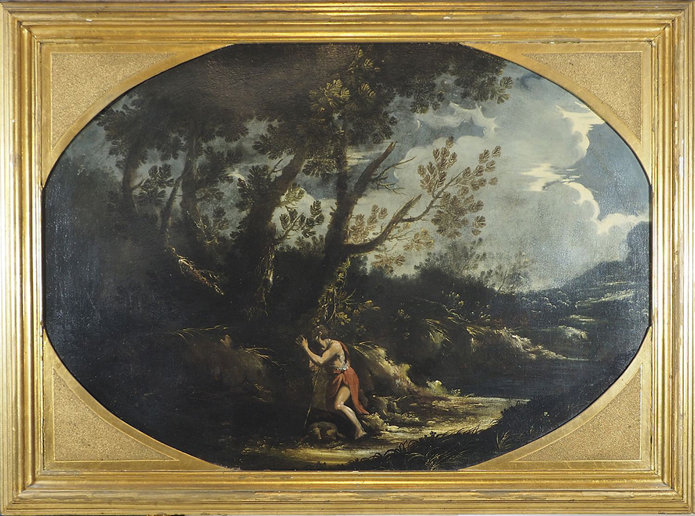 Ambito di Salvator Rosa 1615-1673 "San Giovanni Eremita" cm. 84x119 - olio su tela foderata Prov.: collezione Basilio Trieste. Esposiz.: mostra d'arte antica, Trieste 1925.