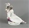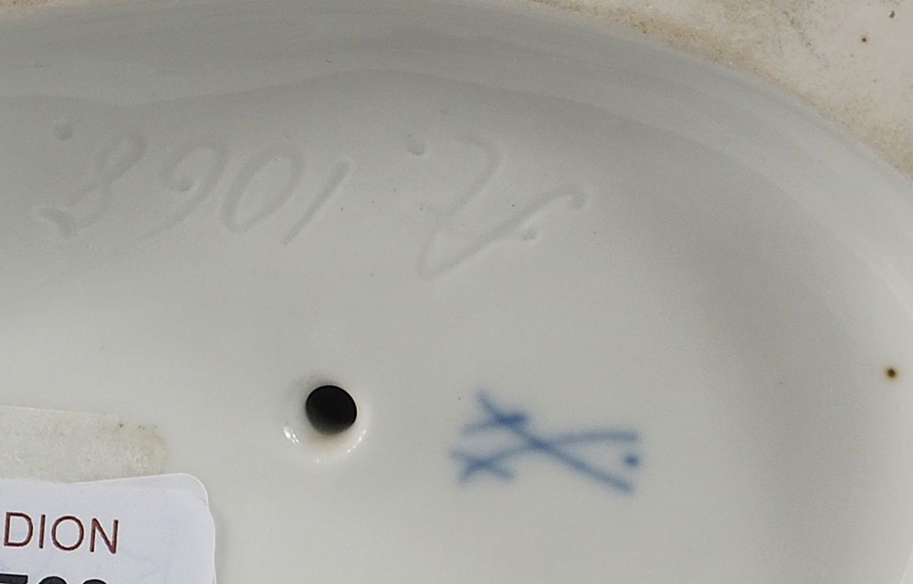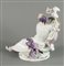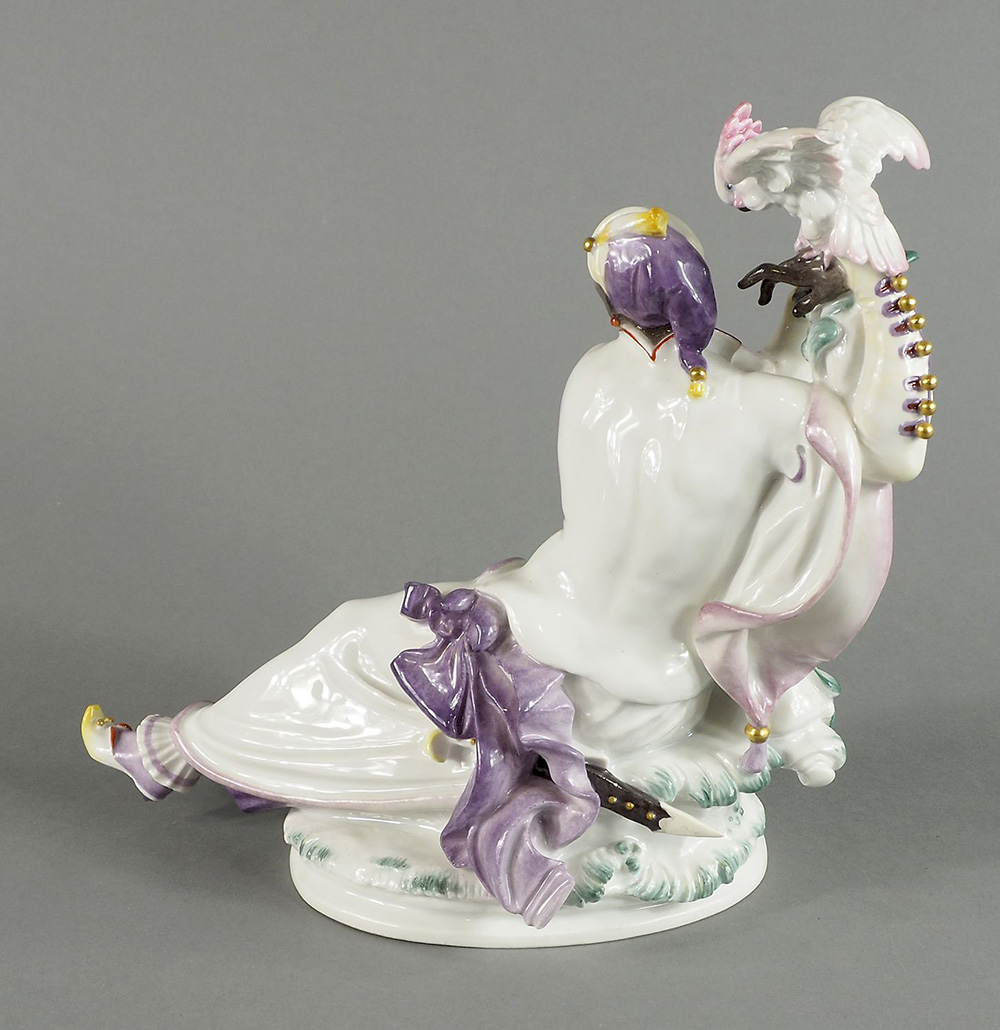 Meissen Spade: scultura in porcellana policroma raffigurante personaggio orientale con uccello. Inizio XX secolo. Lung. cm. 24.