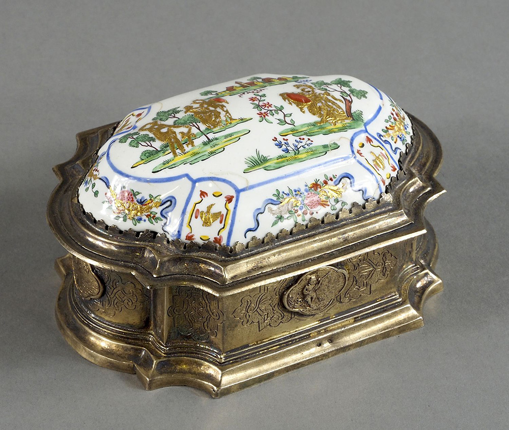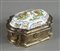 Scatoletta portagioie in argento dorato finemente inciso con figure, sul cperchio scena di paesaggio a smalti policromi e oro, interno in argento dorato. XVIII secolo. cm. 5x10,5x7,5.