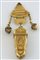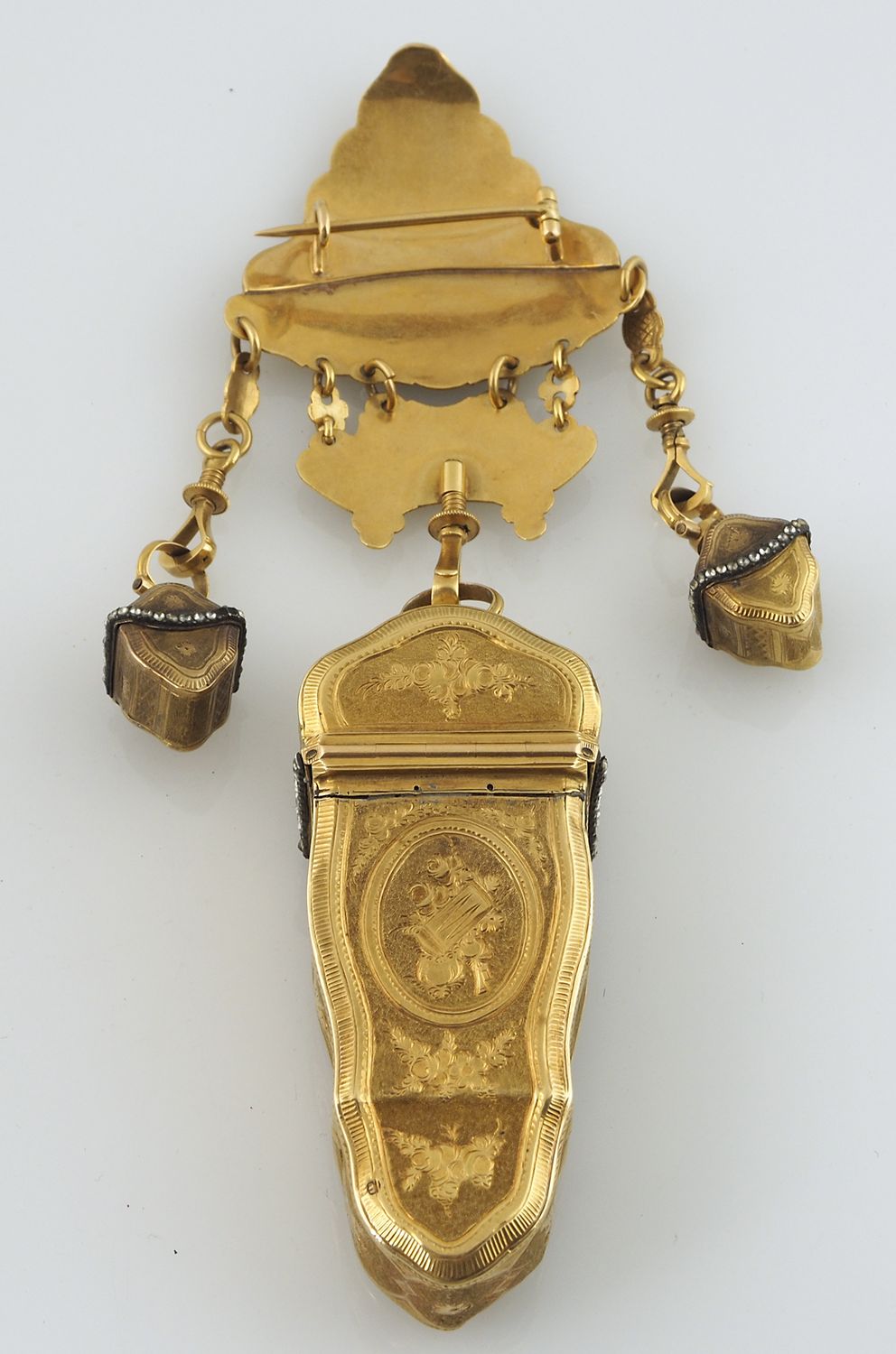 Splendido etui da viaggio in oro giallo e brillantini, incisioni a motivi floreali e musicali, con ai lati 2 piccoli contenitori e al centro cofanetto contenente accessori vari in oro tra cui carnet da scrittura, cucchiaino e forbicine. Entro astuccio originale in pelle con stemma nobiliare. II metà XVIII secolo.