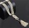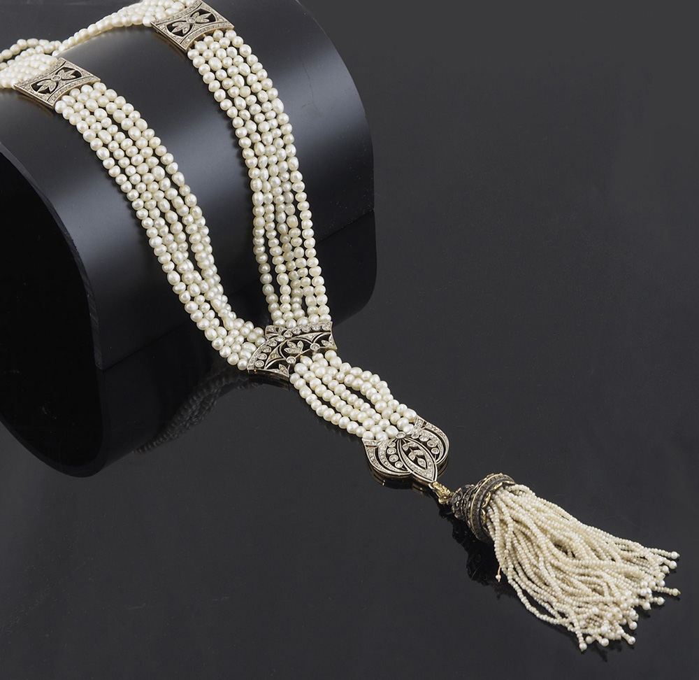 Bellissima collana a 5 fili di perline intervallate da piastrine in oro bianco ricoperte da brillantini, con pendente. Anni '20.