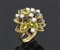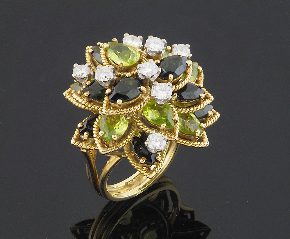 Grande anello a cupola in oro giallo 14 kt a forma di fiore, petali composti da tormaline e peridoti con diamanti taglio briallante per ca ct 1,75 ca