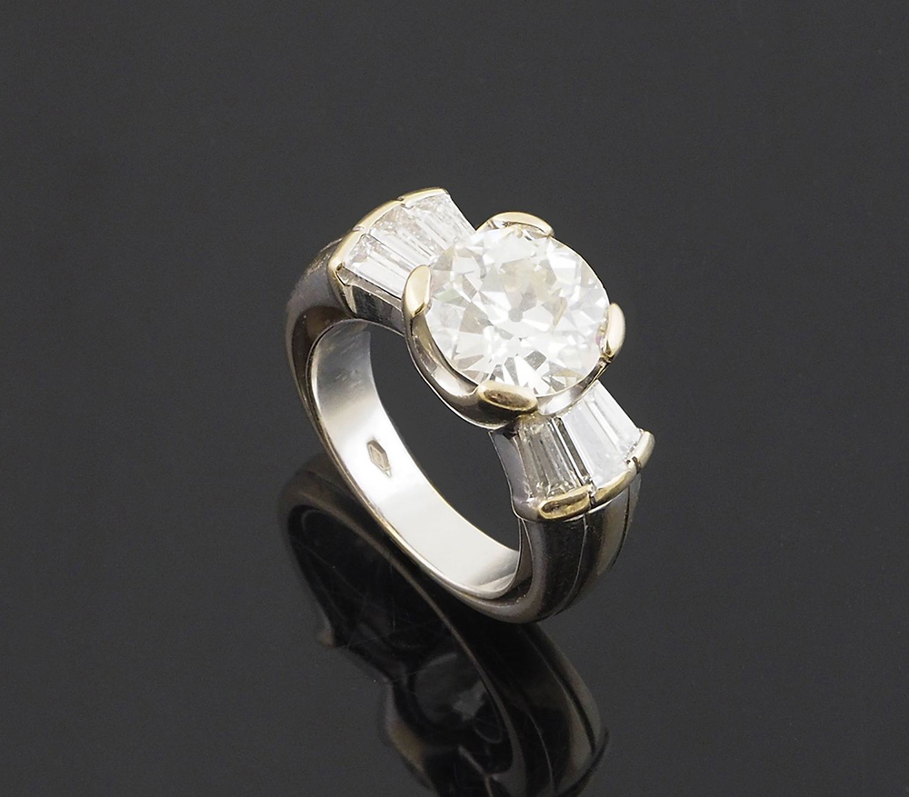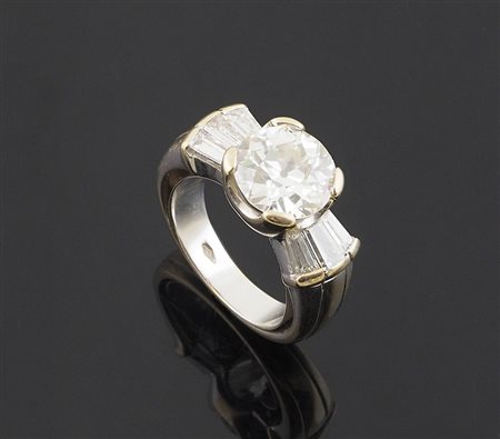 Anello in oro bianco con al centro diamante taglio brillante per ca ct 3- 3,50, colore H-I ,Purezza VS , taglio rotondo Vecchia Europa, ai lati da 6 diamanti taglio baguette per ca tot 1,30-1,80, colore F-G, purezza VVS-VS (Con Certificato D.G.C.)
