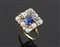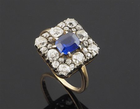 Anello in oro giallo e bianco di forma quadrata con diamanti taglio brillante per tot ca ct ,170 centrato da zaffiro sintetico