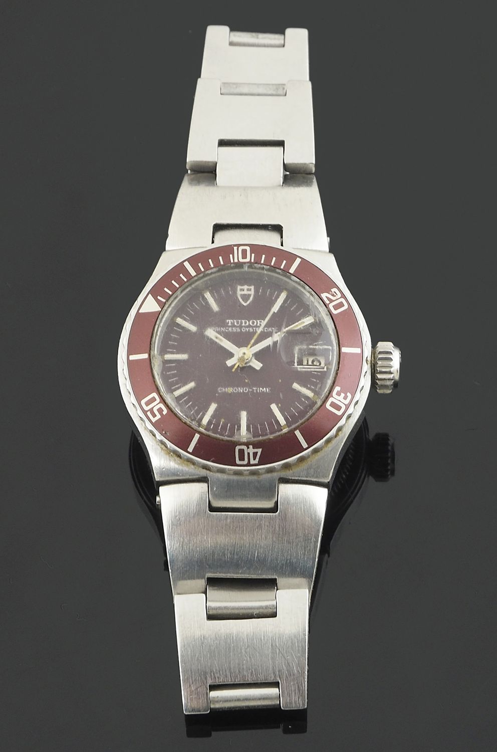 Tudor: orologio da polso da donna in acciaio con qyadrante e ghiera rosse, cinturino originale in acciaio. Fondello e corona marcati Rolex. Diam. cm. 2,5.