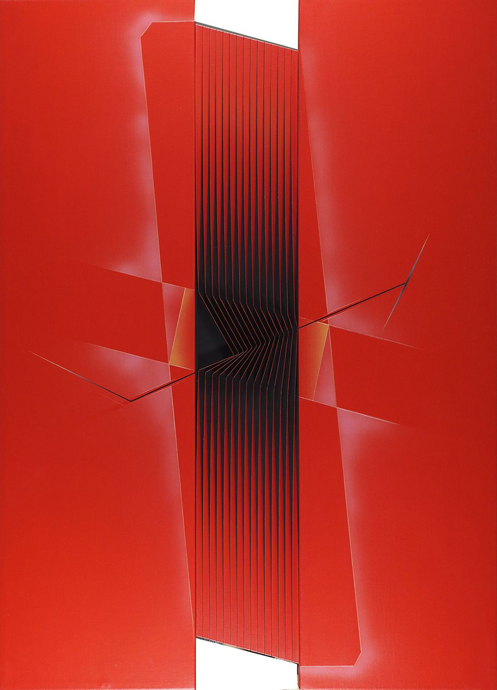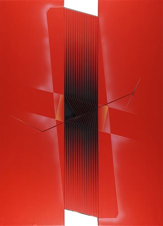 Alberto Biasi 1937 "Nel senso relativo" cm. 140x100 - acrilico su tela (formato irregolare) Al retro firma, titolo e data '04; timbro dell'Artista; timbro Casa del Mantegna. Pubbl.: catalogo "Alberto Biasi e Julio Le parc, l'arte dell'instabilità" a cura di G. Granzotto 2005, pag.67.