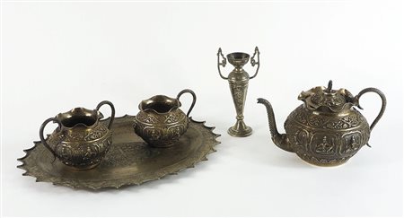 Servizio da caffè in argento finemente lavorato a sbalzo con figure indiane e motivi floreali, composto da 5 pezzi. Fine XIX secolo. gr .tot 1450.