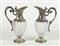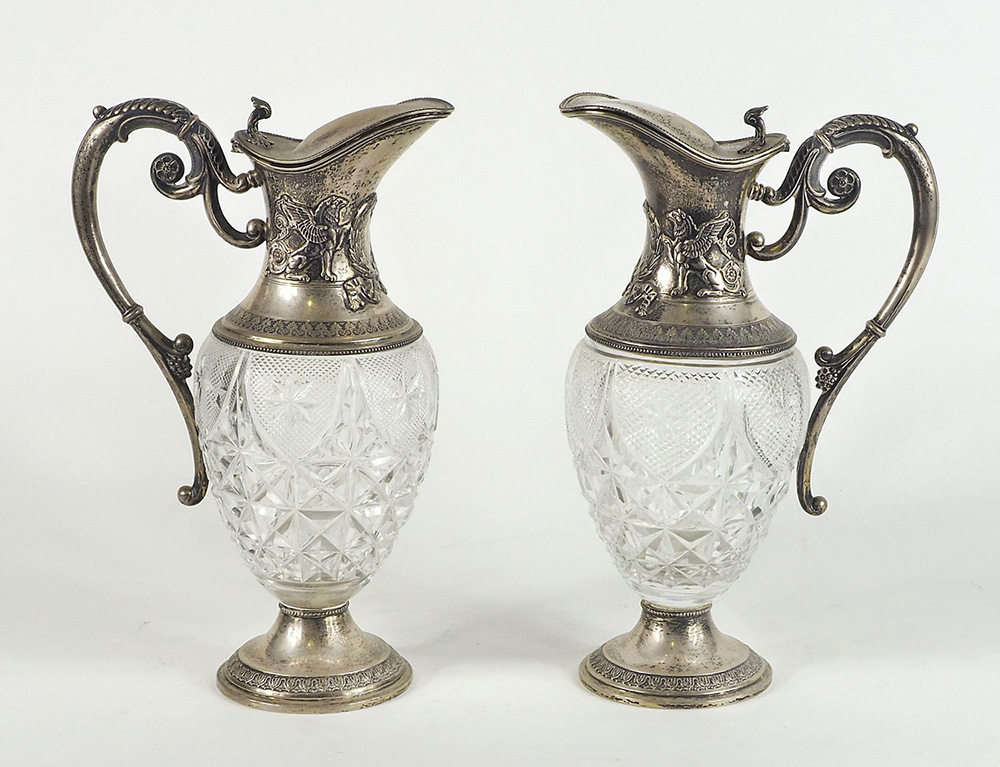 Coppia di brocche in cristallo con base, collo e manico in argento finemente...