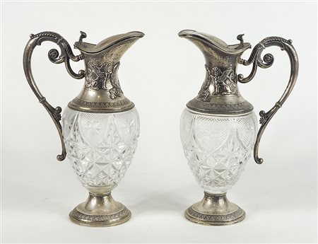 Coppia di brocche in cristallo con base, collo e manico in argento finemente sbalzato. Germania, inizio XX secolo. H: cm. 29,5.