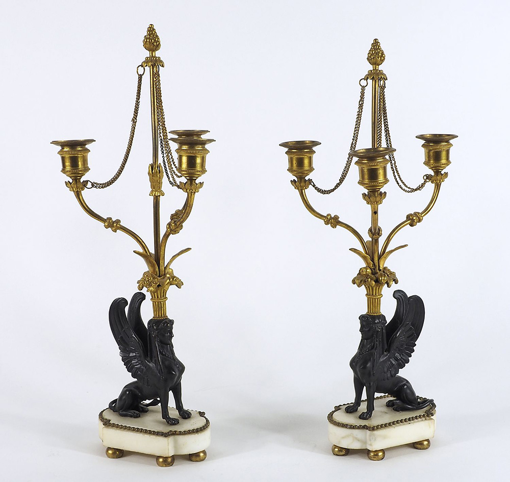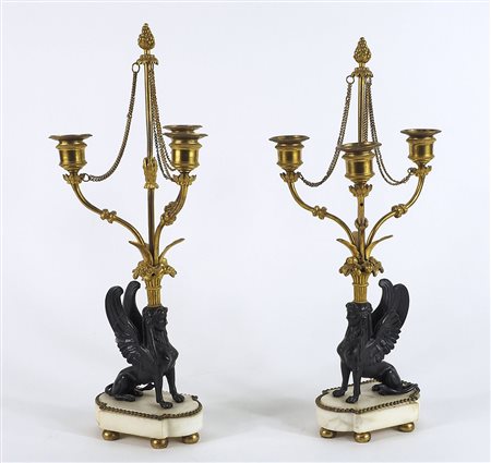Paio di candelabri a 3 luci in bronzo a 2 colori, su base in alabastro. XIX secolo. H. cm. 42.