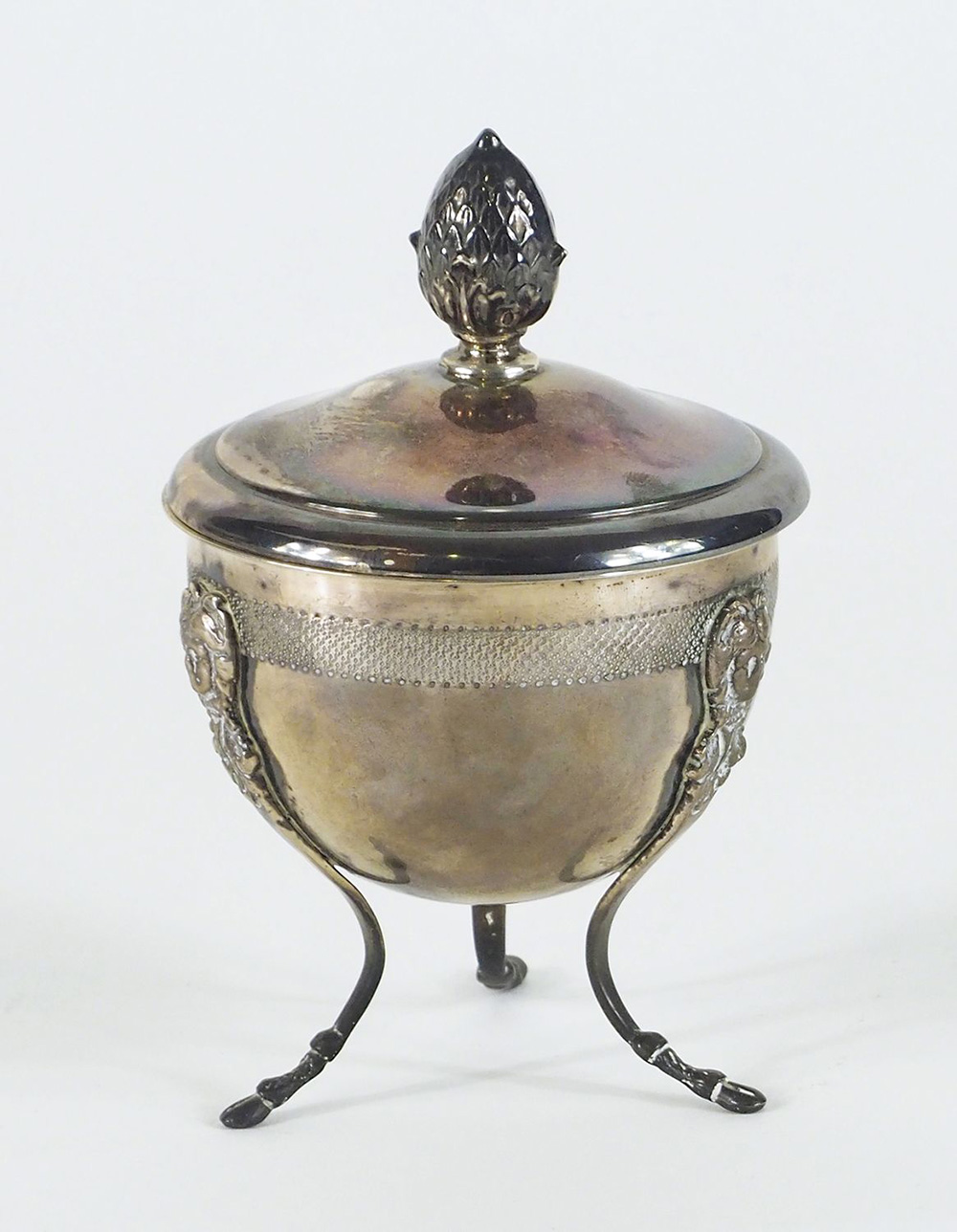 Piccola zuccheriera in argento con coperchio, poggiante su tre piedini. Punzoe Venezia, I mtà XIX secolo. H. cm. 14. Prov.: collezione Basilio Trieste.