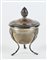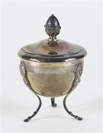 Piccola zuccheriera in argento con coperchio, poggiante su tre piedini....