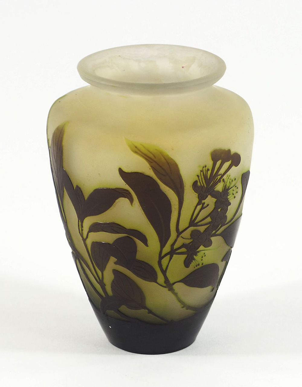 Emil Gallè 1846-1904 Vaso in vetro nei toni del verde e marrone con decori....
