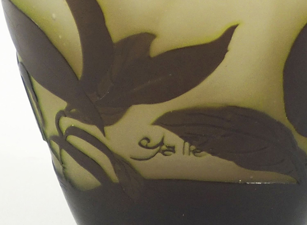 Emil Gallè 1846-1904 Vaso in vetro nei toni del verde e marrone con decori. Firmato. H. cm. 12.