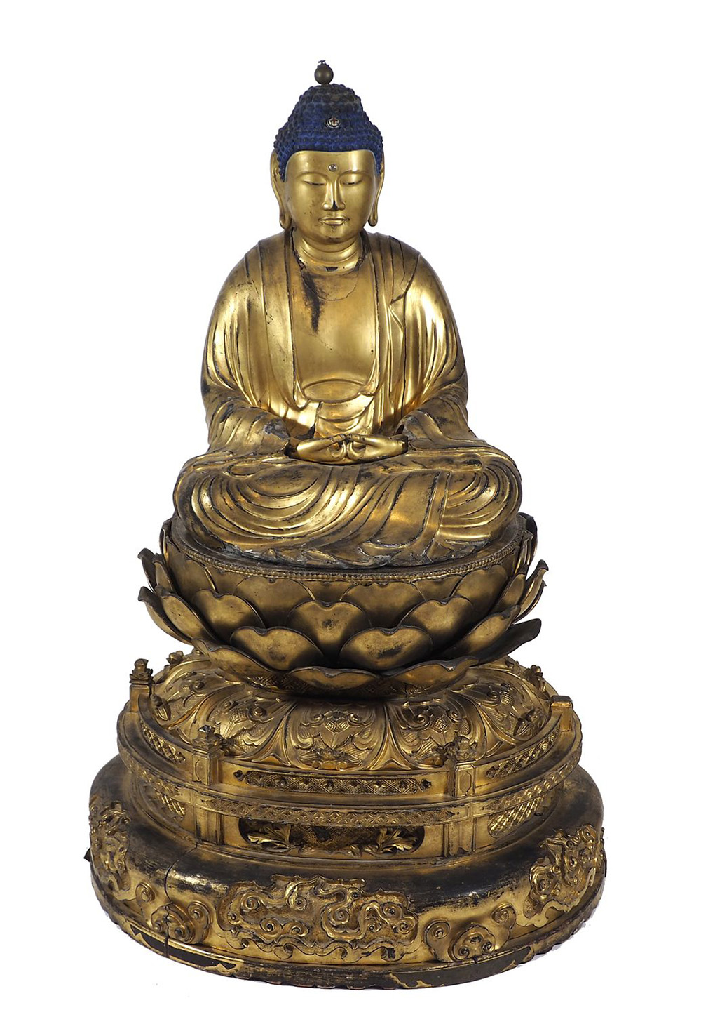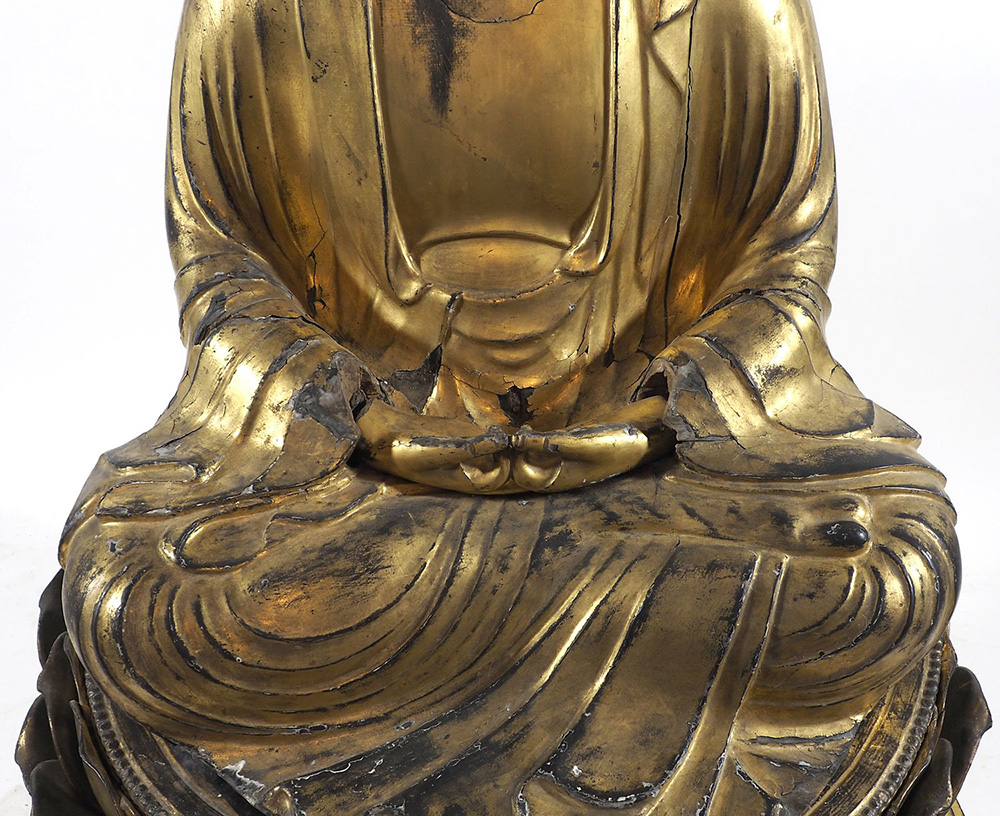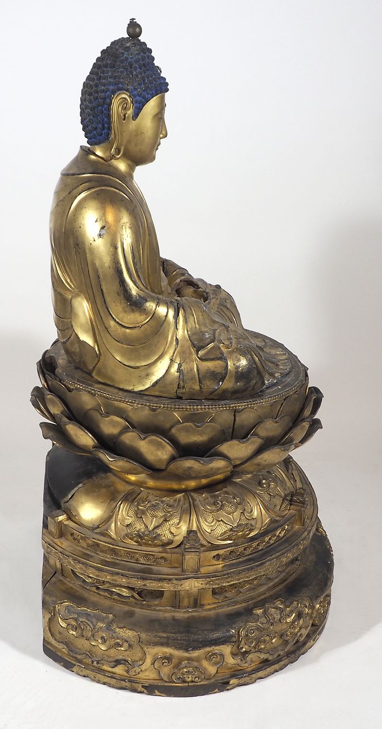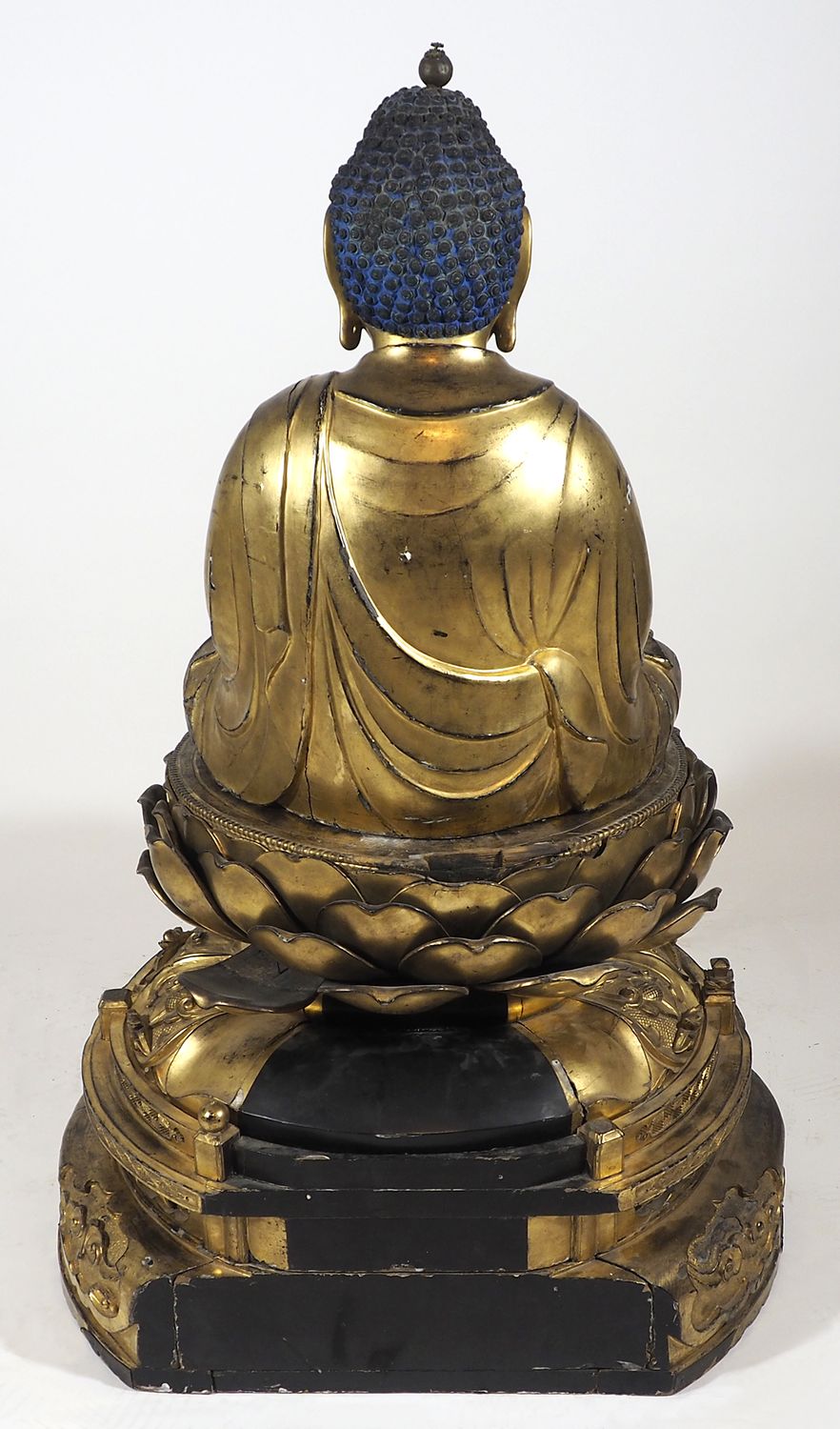 Grande scultura in legno dorato scolpito raffigurante Buddha in meditazione, base in legno dorato. Periodo Edo. H. tot cm.135.