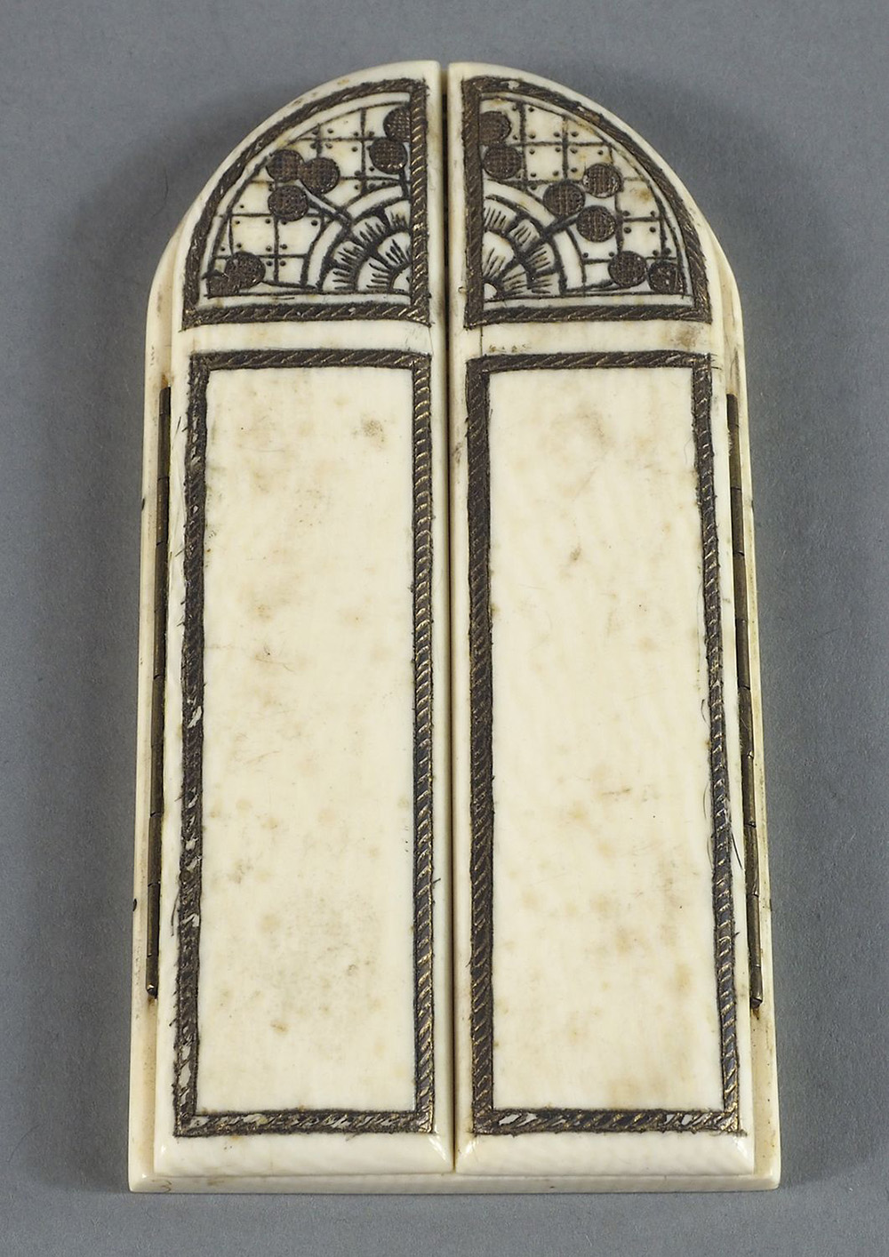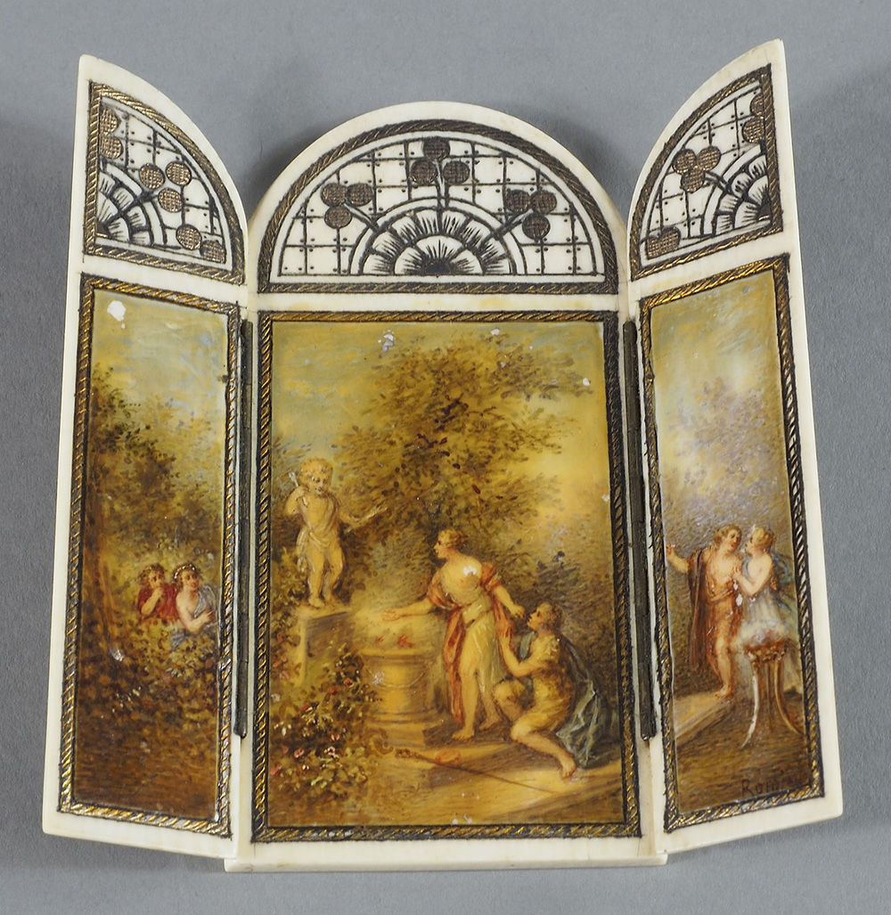 Piccolo paravento a 3 ante in avorio con interno dipinta una scena con personaggi e decori incisi. XIX secolo. cm. 10x5 (chiuso).