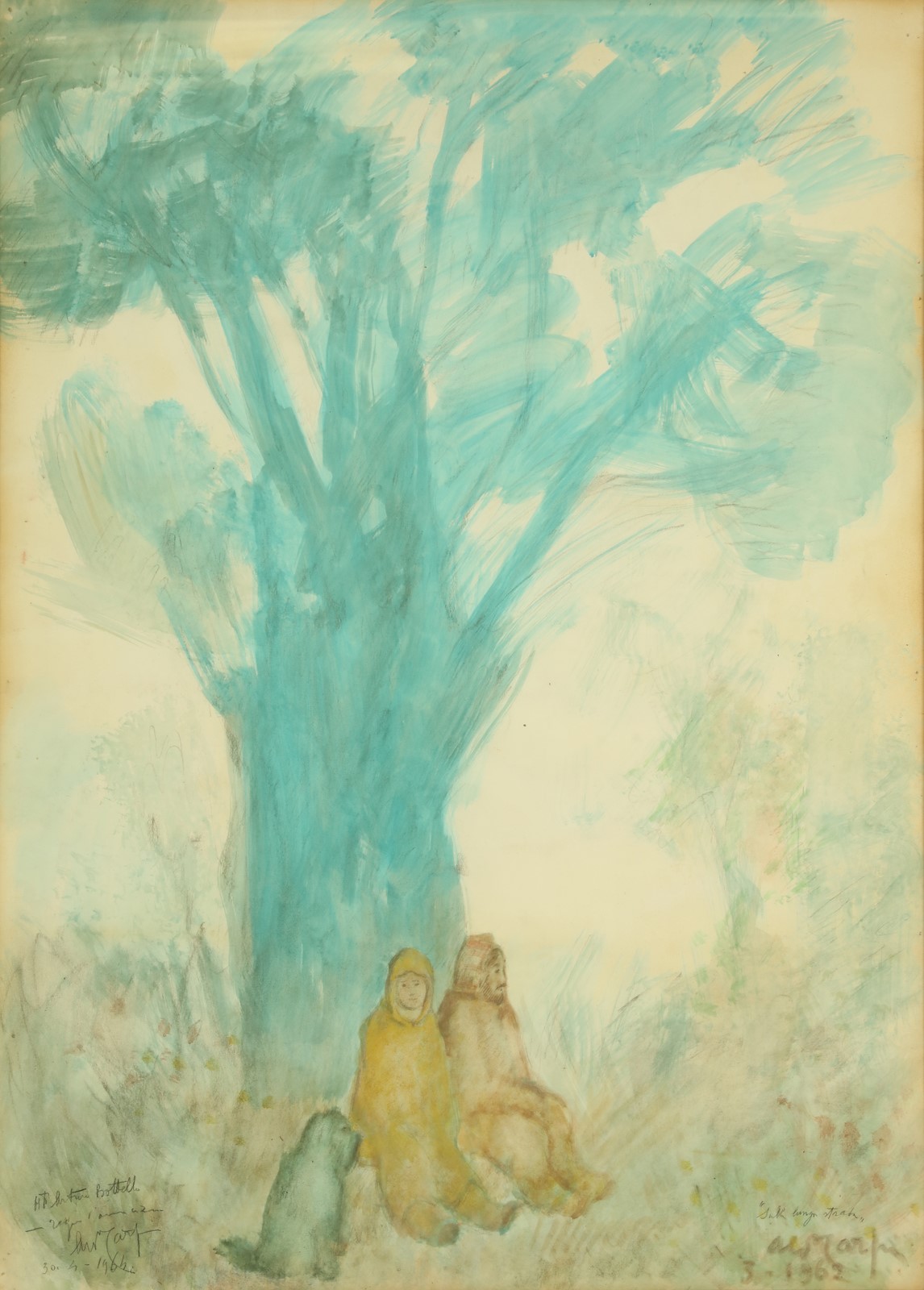 CARPI ALDO (1886 - 1973) Sulla lunga strada. 1962. Gouache su carta. Cm 70,00 x 100,00. Titolo, firma e anno in basso a destra. Dedica in basso a sinistra datata 1964. Cornice presente