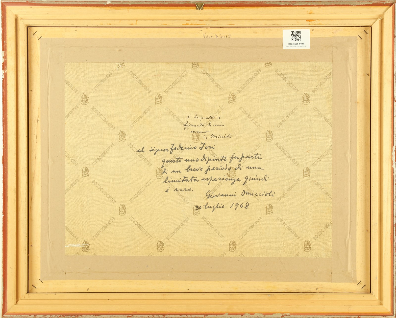 OMICCIOLI GIOVANNI (1901 - 1975) Senza titolo. 1968. Olio su tela . Cm 70,00 x 45,00. Firma in basso a destra. Al retro firma, dedica e anno. Cornice presente