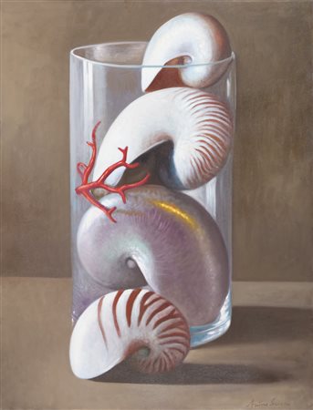 SCIACCA ANTONIO (n. 1957) Stella marina e vetro. Olio su tela . Cm 70,00 x 90,00. Firma in basso a destra. Al retro firma. Autentica dell'artista su fotografia.