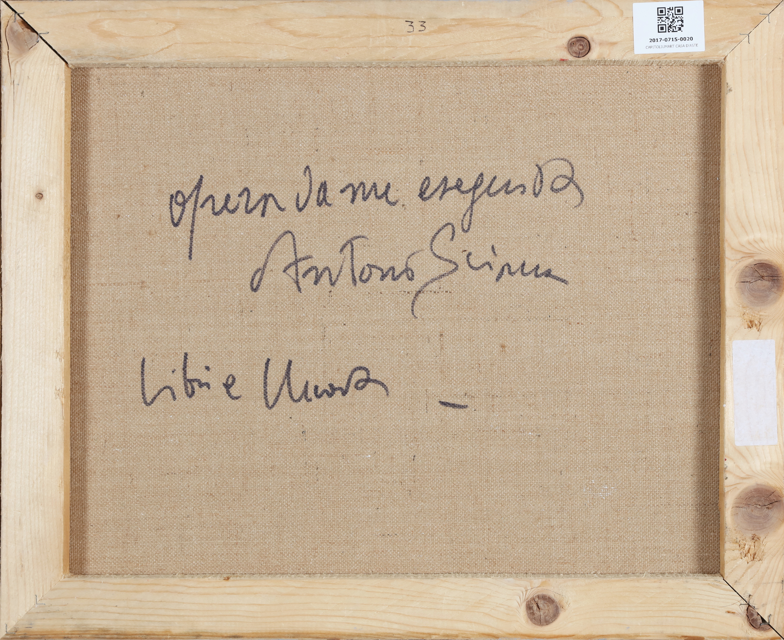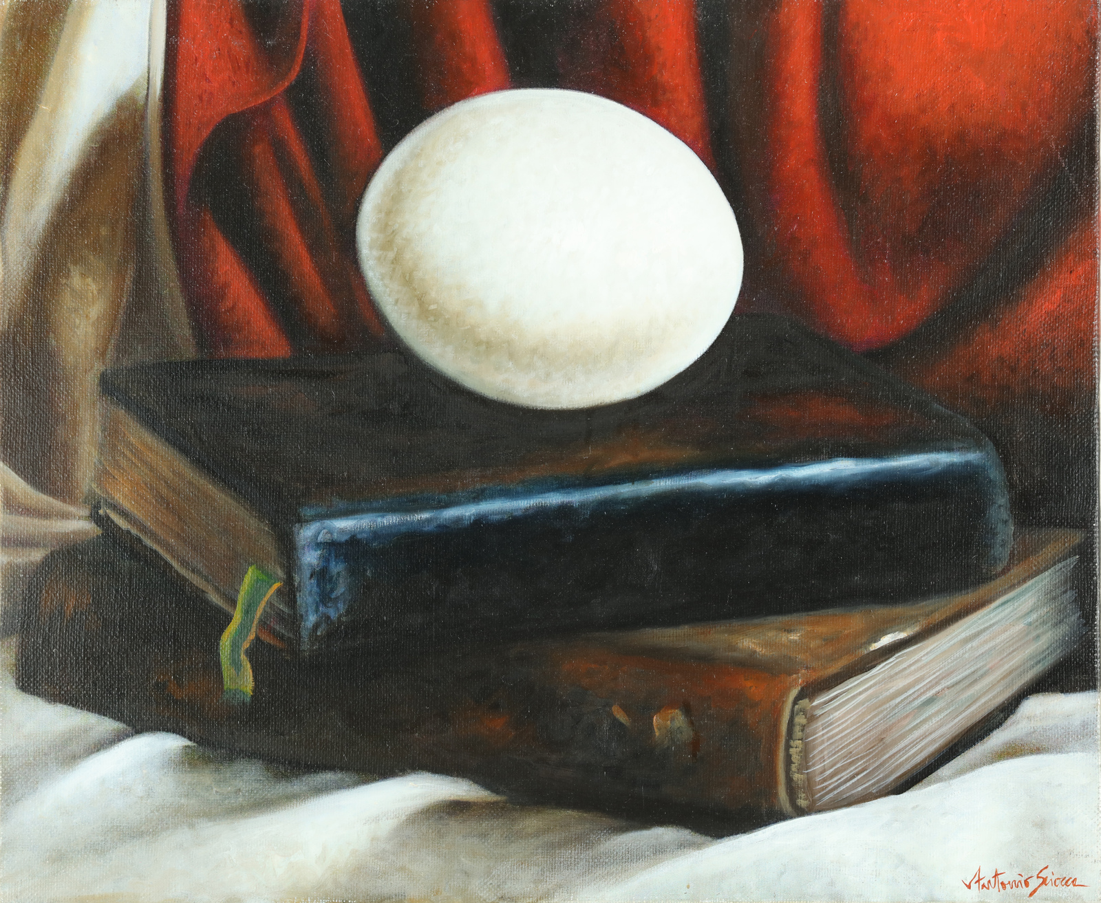 SCIACCA ANTONIO (n. 1957) Books and egg. Oil on canvas . Cm 60,00 x 50,00. Signature lower right. At the back title abd signature. Artist's authenticity certificate on photo.