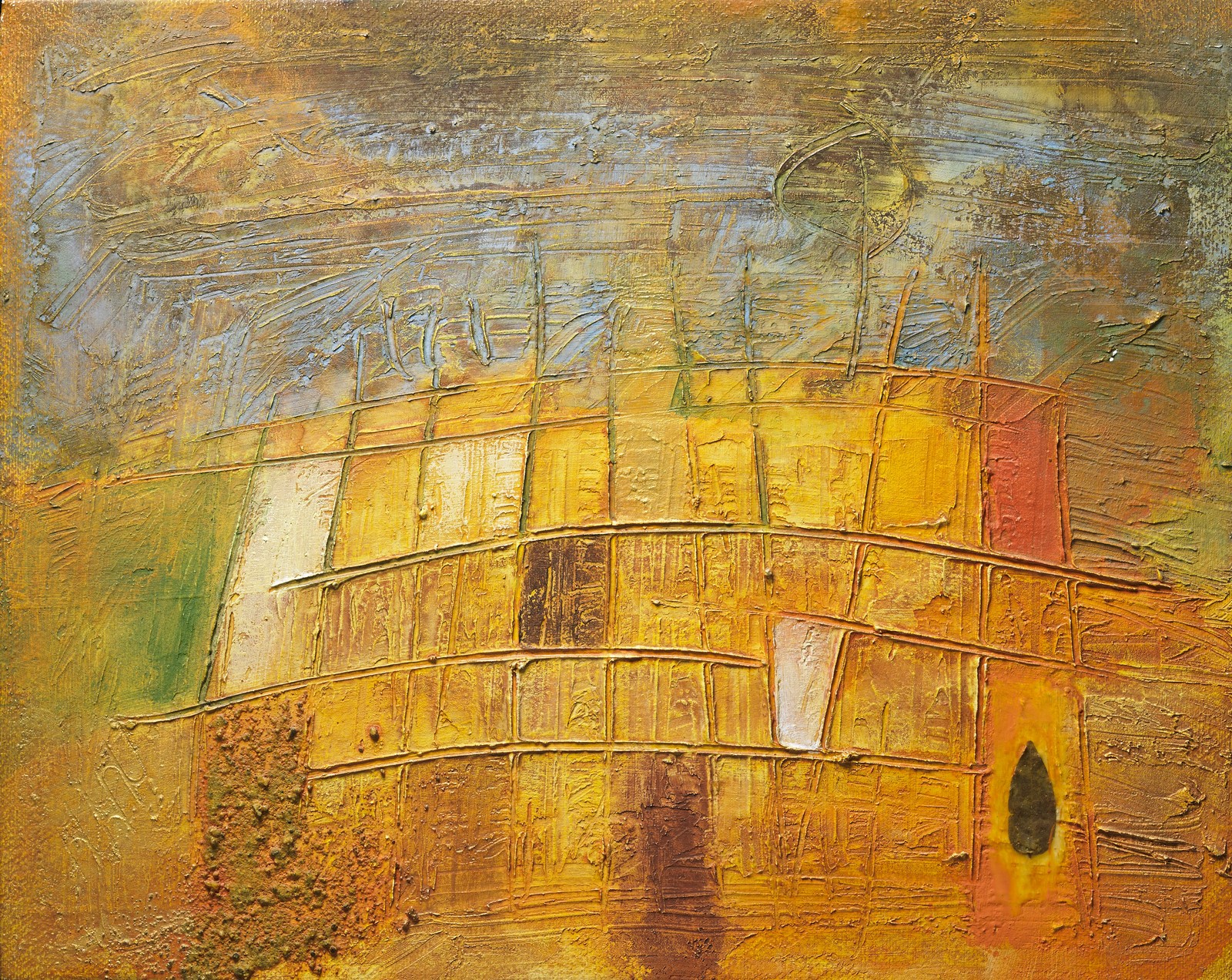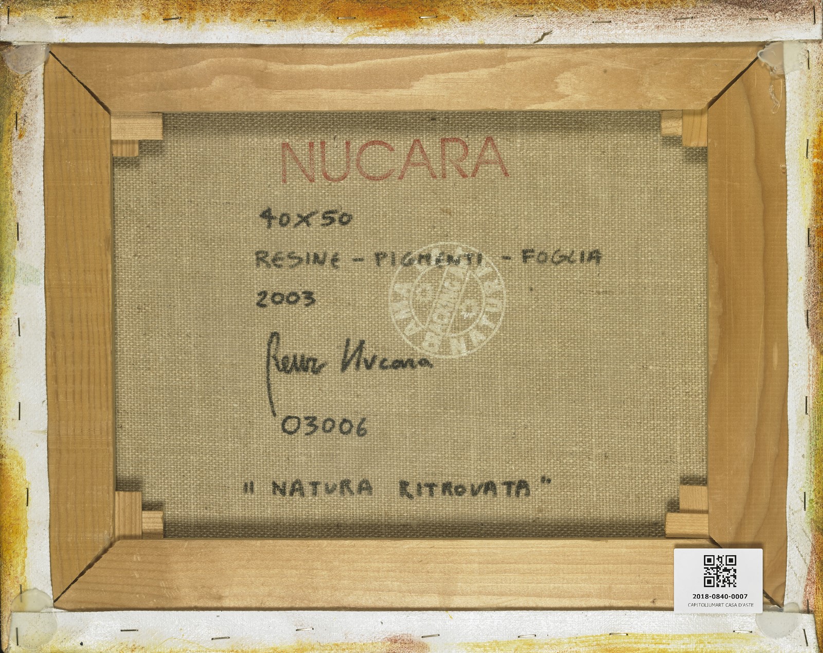 NUCARA RENZO (n. 1955) Natura ritrovata. 2003. Tecnica mista su tela. Cm 50,00 x 40,00. Al retro titolo, firma, anno e timbro Cracking art. Cornice presente