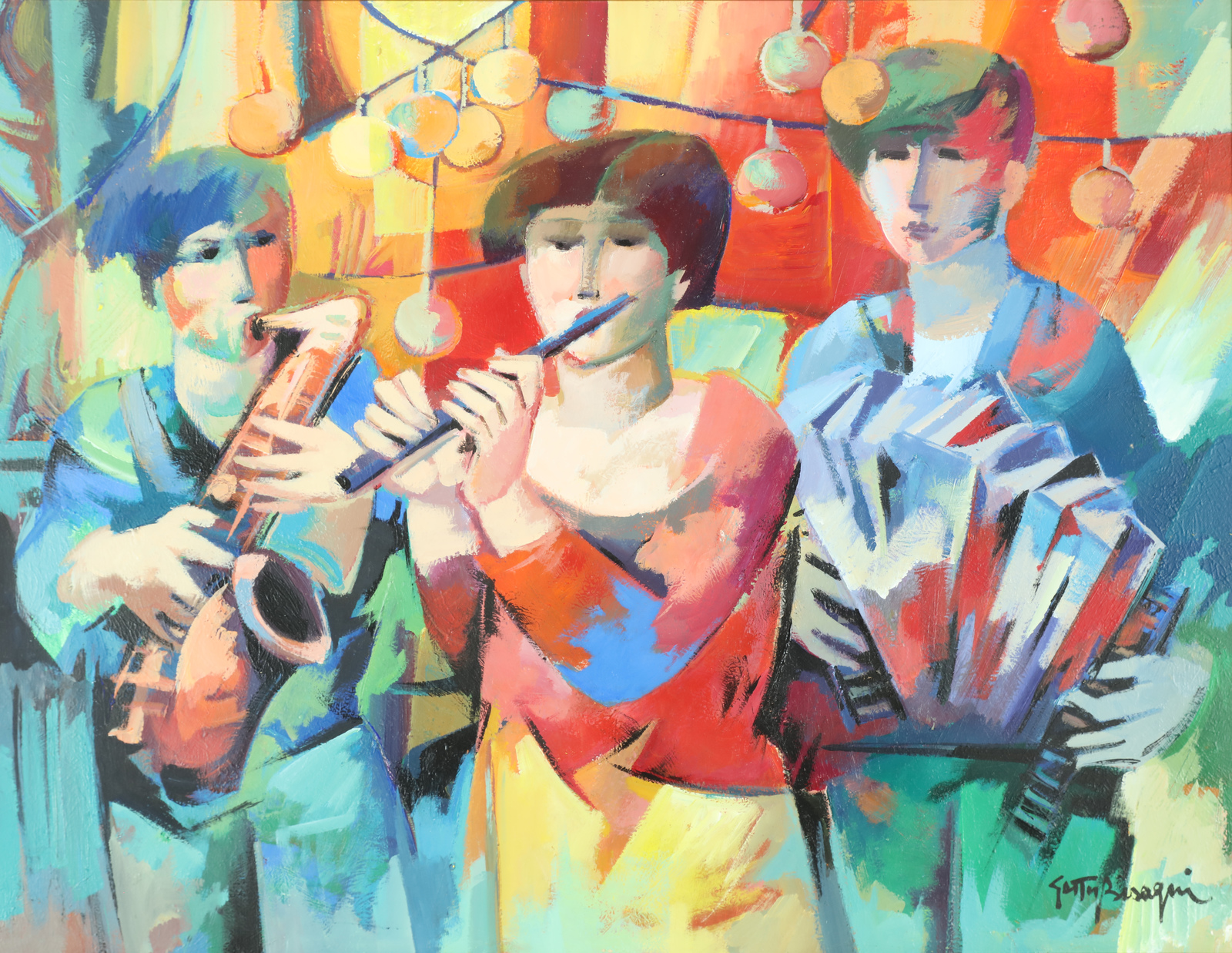 BISAGNI GETTY (n. 1931) Musical trio. Oil on canvas . Cm 80,00 x 60,00. Signature lower right. Title at the back. Mimmo Massante Modern and contemporary art, Milan authenticity certificate on photo with artist's signature. Cornice presente