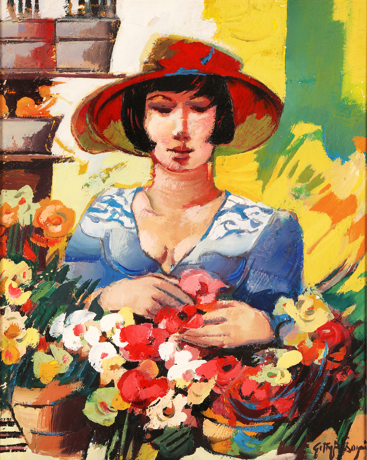 BISAGNI GETTY (n. 1931) The florist. Oil on canvas . Cm 40,00 x 50,00. Signature lower right. Title at the back. Mimmo Massante modern and contemporary art, Milan authenticity certificate. Artist's authenticity certificate on photo. Cornice presente