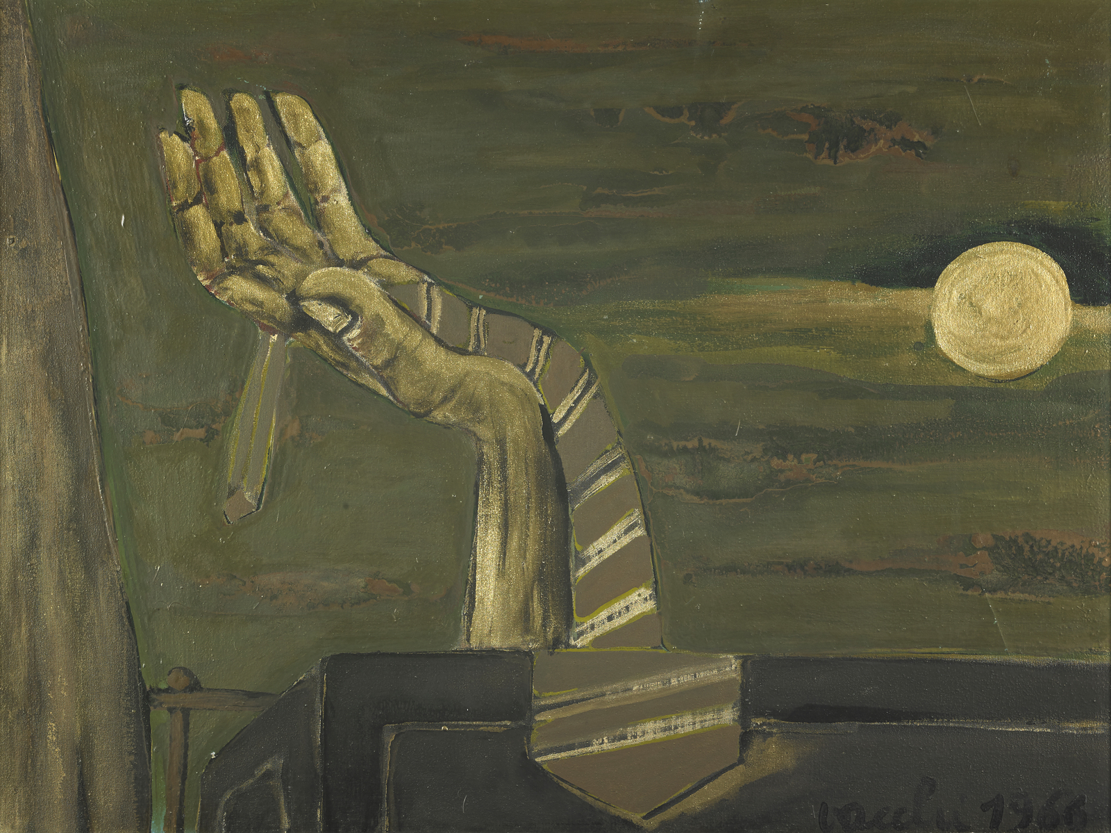 VACCHI SERGIO (n. 1925) Cravatta al chiaro di luna. 1966. Olio su tela . Cm 80,00 x 60,00. Firma e anno in basso a destra. Al retro titolo, firma e anno. Presenti lievi difetti. Cornice presente