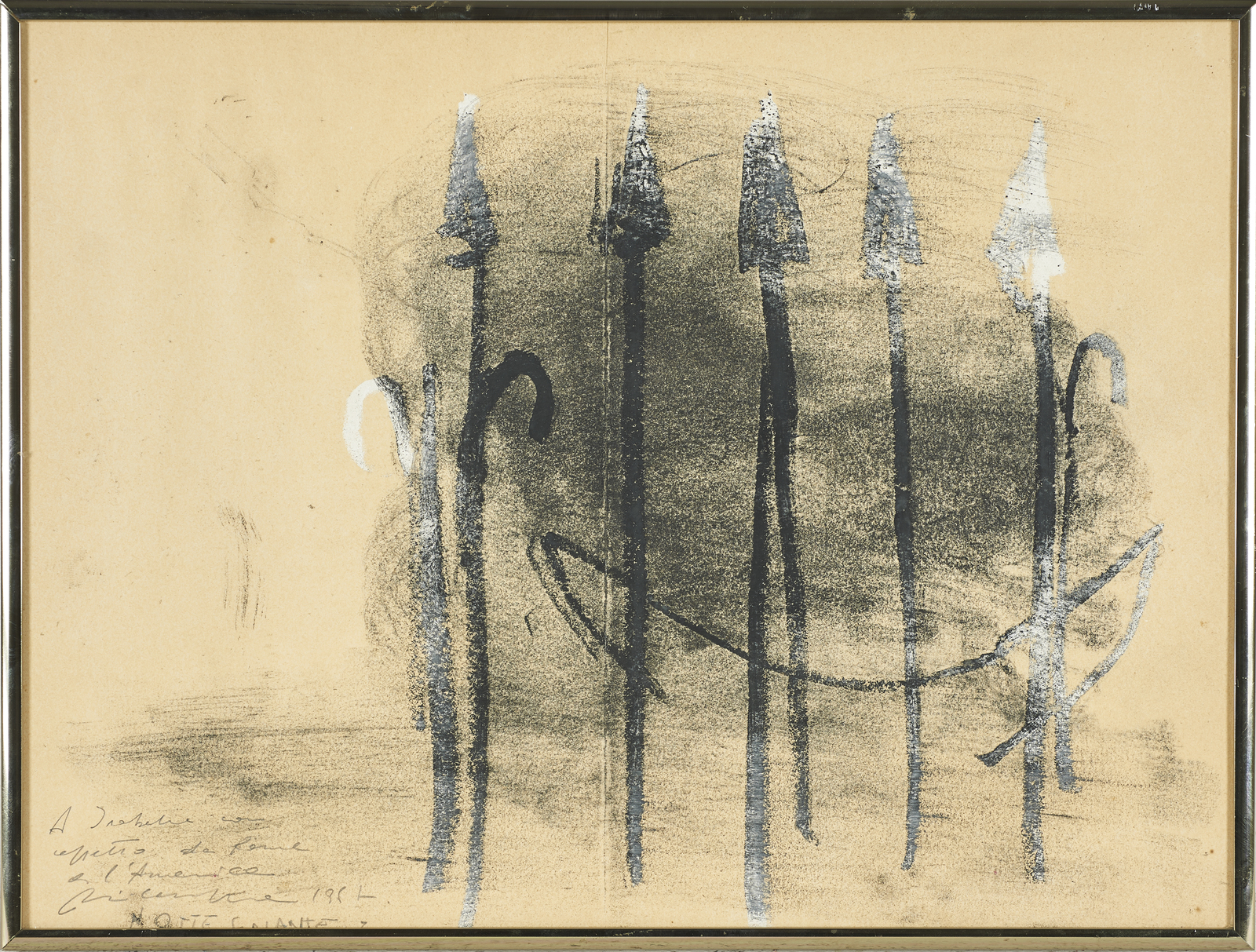 PIZZICANNELLA PIERO (n. 1955) Senza titolo. 1987. Tecnica mista su carta. Cm 30,00 x 20,00. Firma, dedica e anno a matita in basso a sinistra. Cornice presente