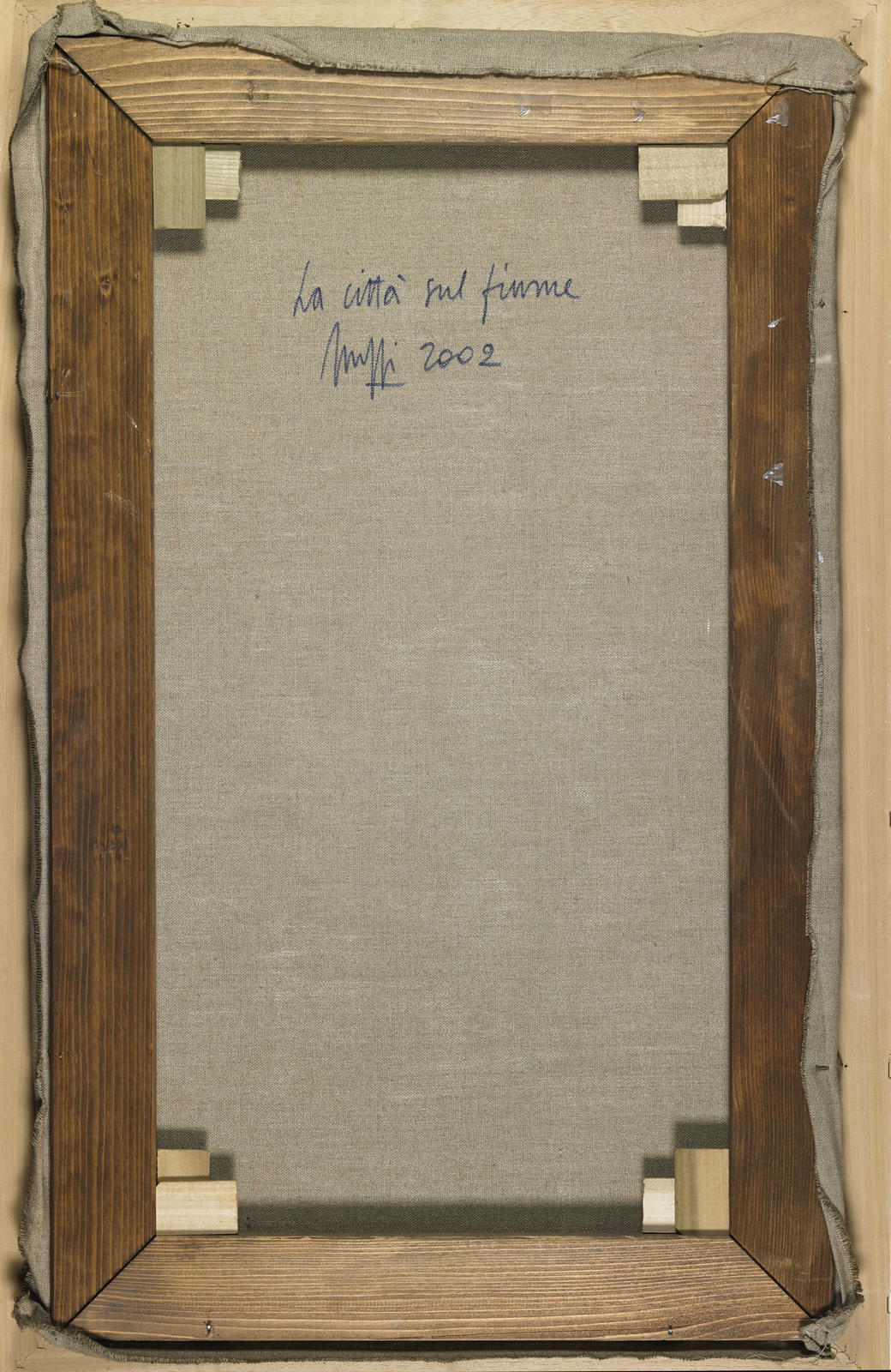 SCUFFI MARCELLO (n. 1948) La città sul fiume. 2002. Olio su tela . Cm 60,00 x 100,00. Firma in basso a sinistra. Al retro titolo, firma e anno. Autentica dell'artista su fotografia riportante il relativo numero d'inventario. Provenienza: Galleria d'arte Orler, Favaro Veneto (VE). Cornice presente