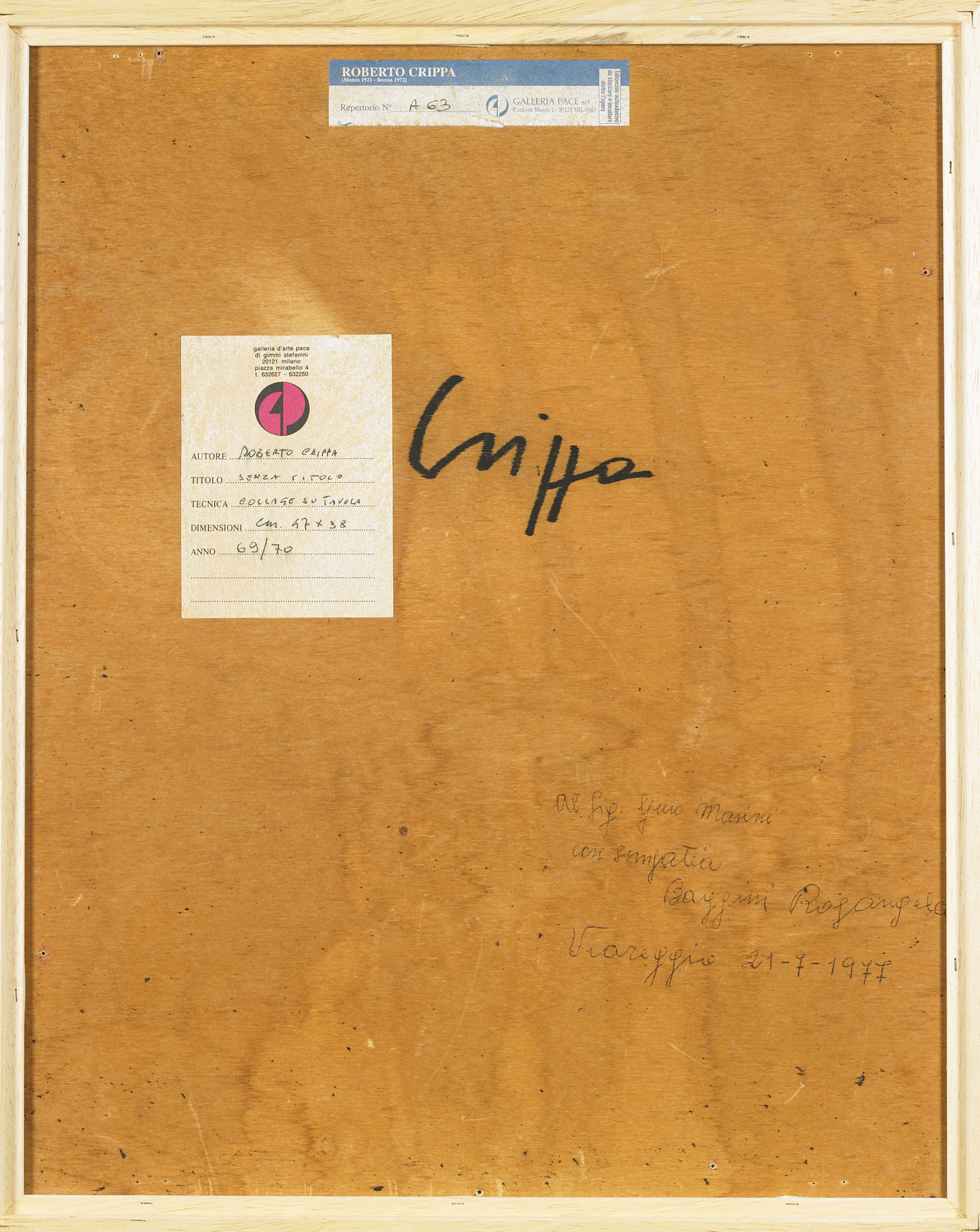 CRIPPA ROBERTO GAETANO (1921 - 1972) Untitled. Mixed media and collage on board. Cm 36,00 x 47,00. At the back signature and Pace Art Gallery, Milan label. Pace Art Gallery, Milan authenticity certificate. Savioli Art Gallery authenticity certificate. 1969/1970.
