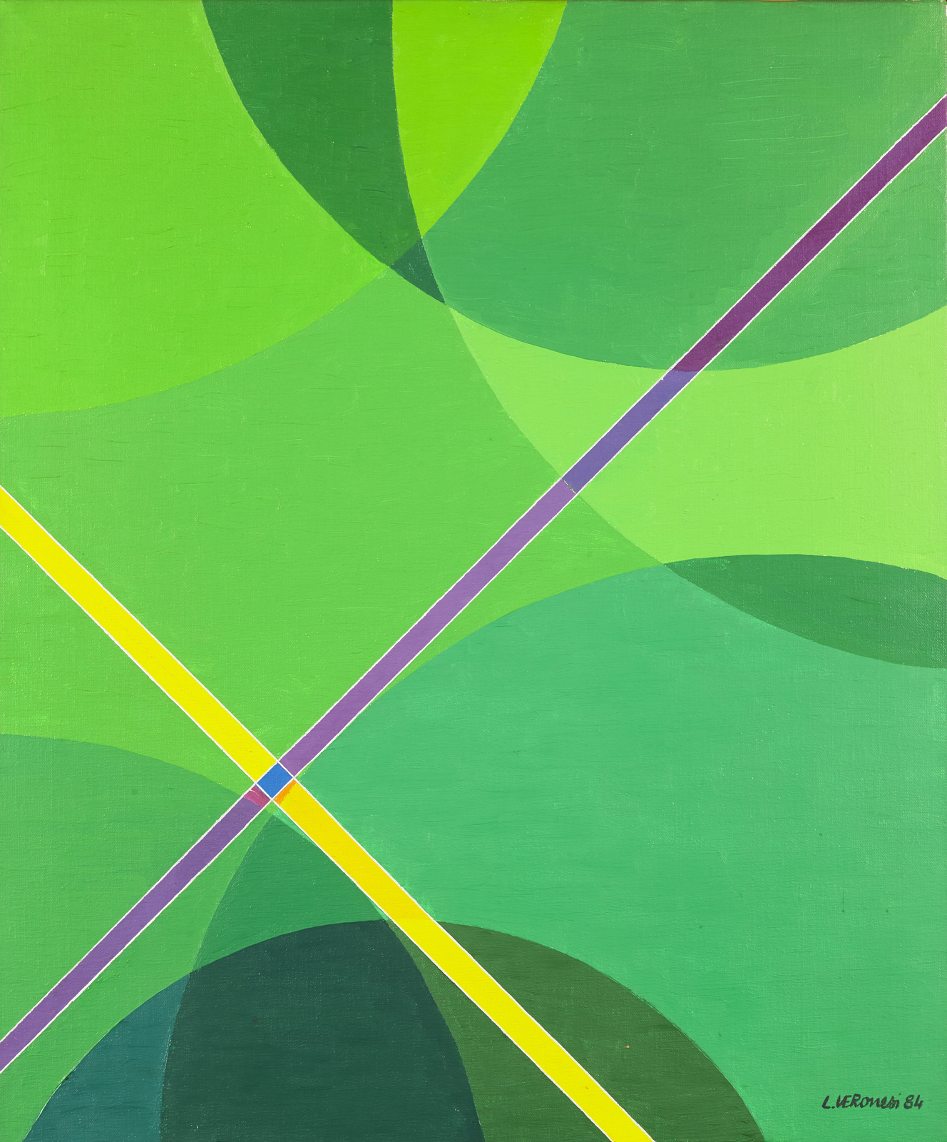 VERONESI LUIGI (1908 - 1998) Composizione. 1984. Tecnica mista su tela. Cm 60,00 x 50,00. Firma e anno in basso a destra. Al retro titolo, firma e anno.