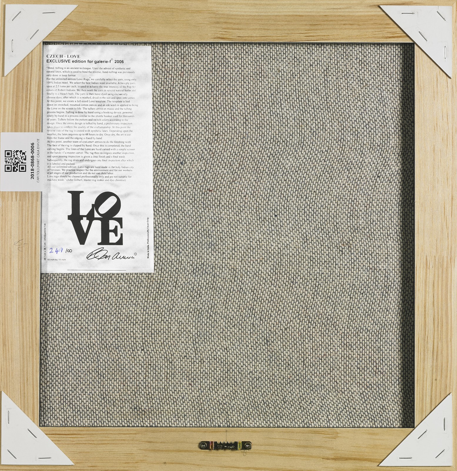 INDIANA ROBERT (n. 1928) Czech Love. Carpet. Cm 39,00 x 39,00. N.249. At the back Galerie-F label with edition and artist's signature in print. Limited edition for Galerie - F, Kranenburg, 2006.