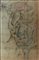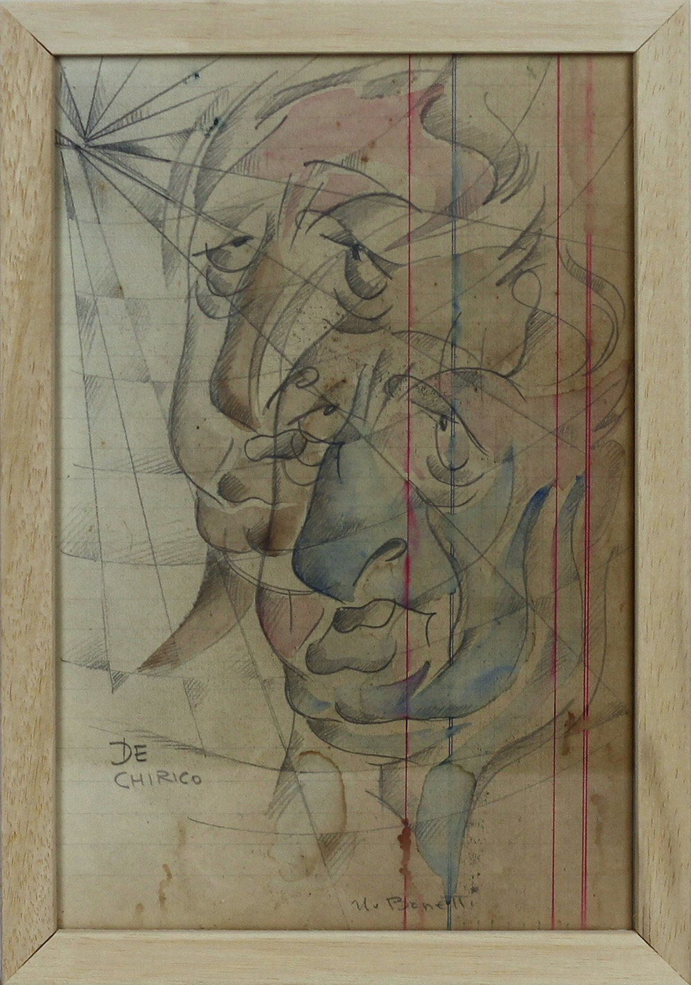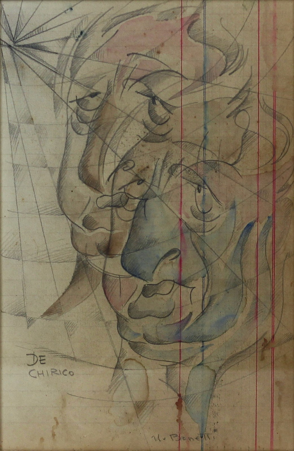 UBERTO BONETTI, Caricatura di De Chirico, Tecnica mista su carta Anni 50 Dim. 16x24,2 Opera archiviata presso l'Archivio Adriana Bonetti N.1113 Firmato in basso al centro