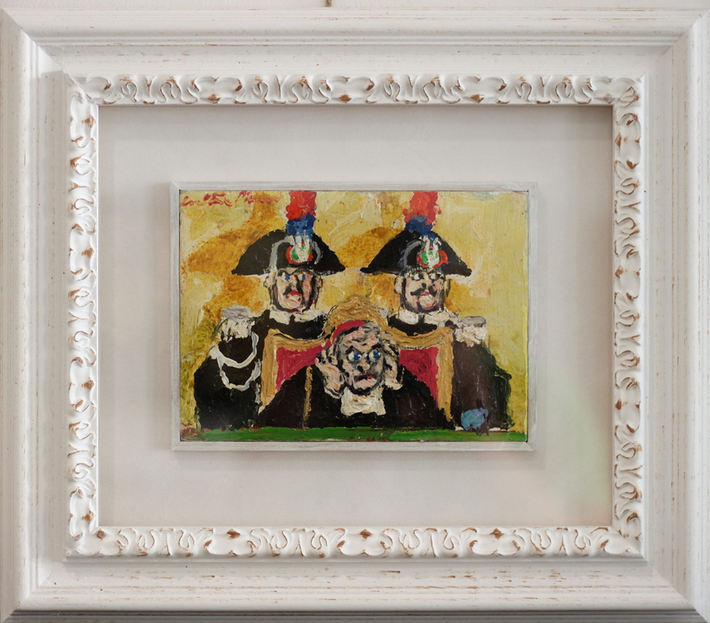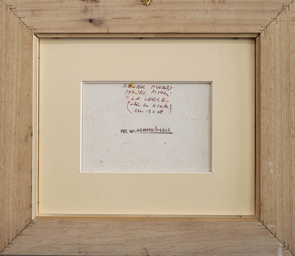 WALTER PIACESI, La legge, Olio su tavola Anno 2011 Dim.13x18 Opera archiviata al N.AGMMH/01642 Al verso Titolo, anno, tecnica, dimensioni, firma e numero di Archivio