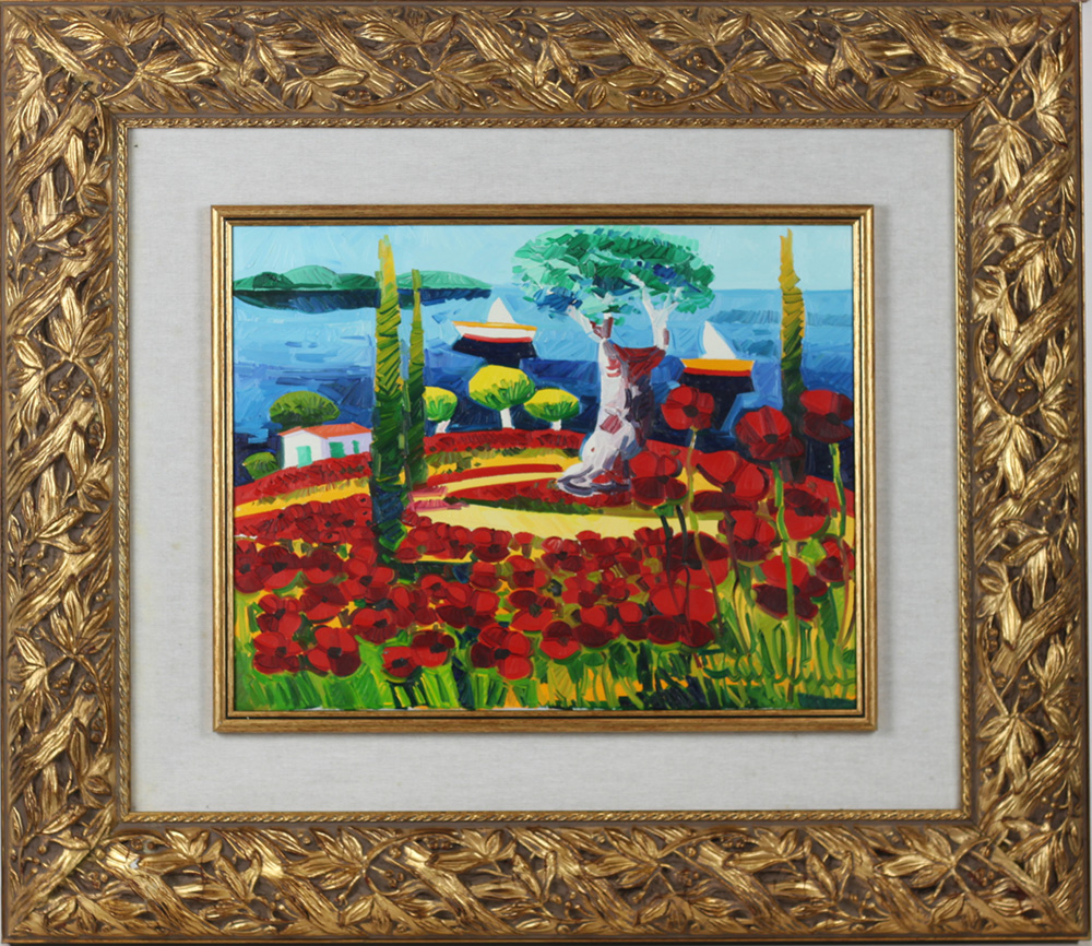 ATHOS FACCINCANI, Papaveri e pini verso il lago, Olio su tela Anno 2006 Dim.35x45 Opera archiviata al N.1135 G presso Archivio Fotografico generale delle opere di Athos faccincani Firmato in basso a dx