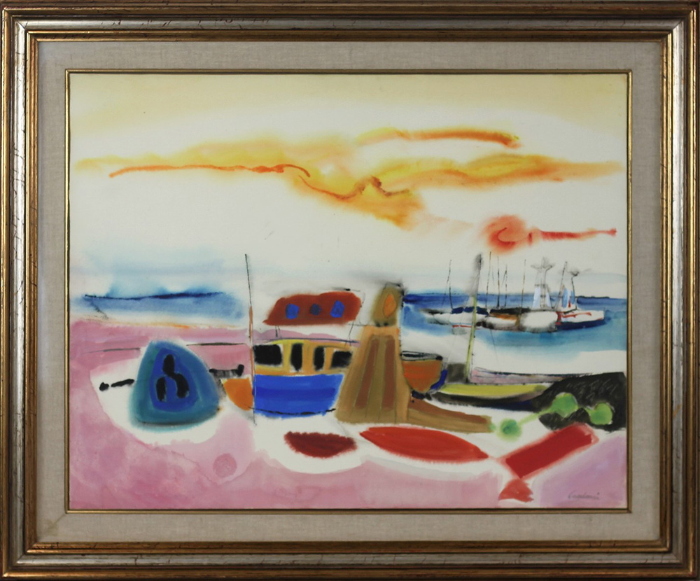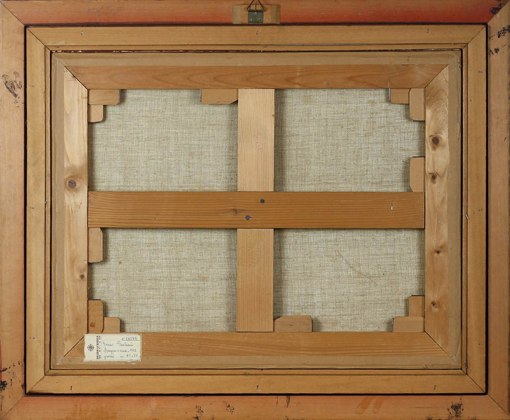 ENRICO PAOLUCCI, Spiaggia e mare, Gouache su carta Anno 1973 Dim.50x65 Al verso Certificato Galleria La Bussola di Torino Firmato in basso a dx