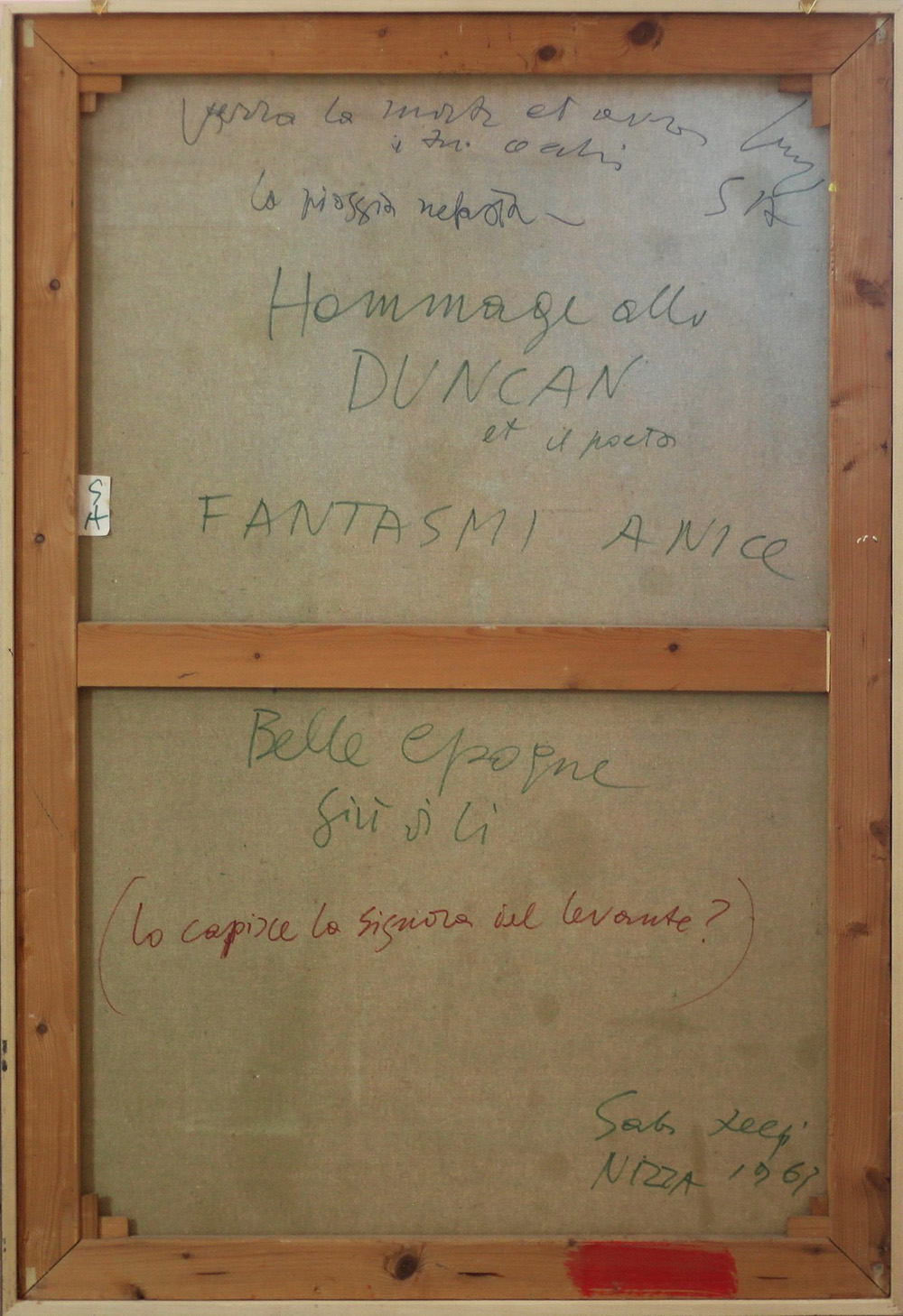 ANTONIO SABATELLI, Homage all duncan, Tecnica mista su tela Anni 60 Dim.120x80 Al verso titolo, data e firma Firmato in basso a dx