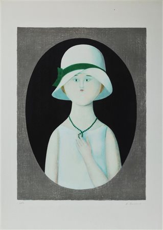 ANTONIO BUENO, Signora con collana, Litografia Anni 80 Dim.70x50 Esemplare P.A. Timbro a secco in basso a sx Timbro a secco in basso a dx Tiratura in basso a sx Firmato in basso a dx