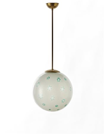 Lampada a sospensione con diffusore sferico. Murano, anni '30. Vetro soffiato pulegoso decorato con murrine in vetro verdino a forma di stella a sei punte. (h cm 86) (lievi difetti)