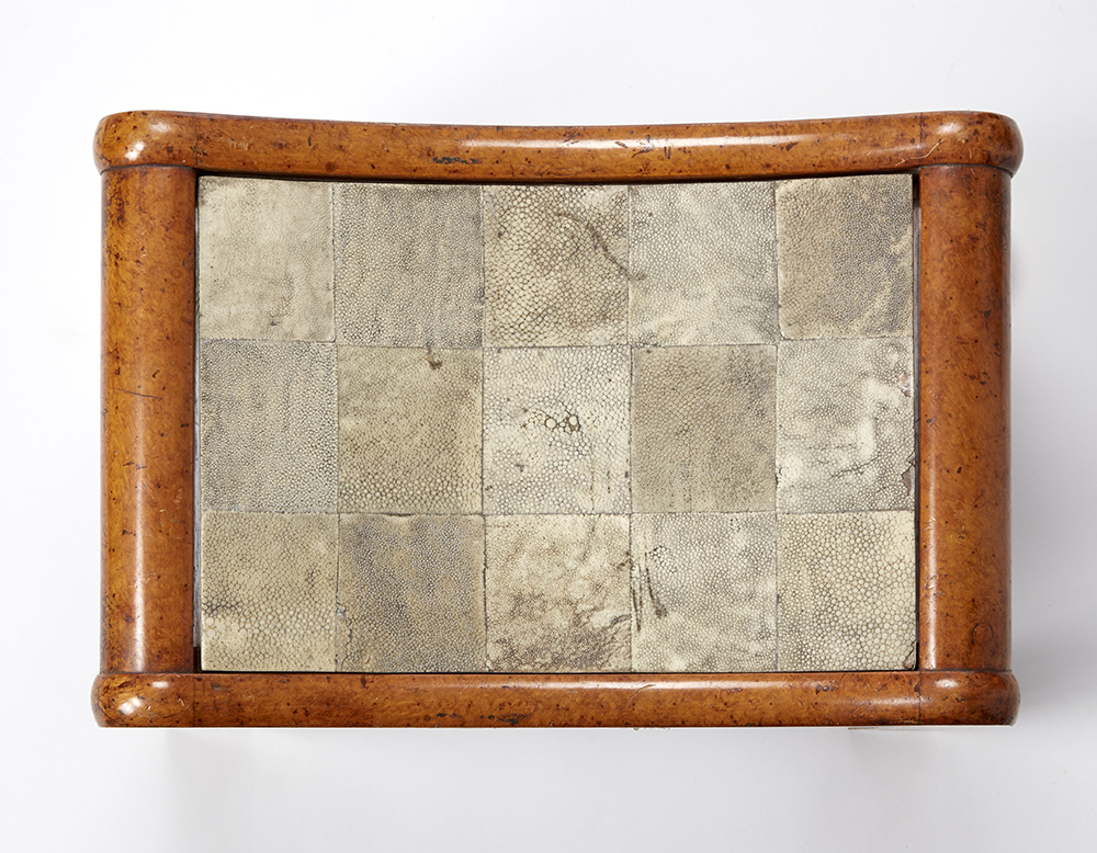 Sgabello modello "Curule SN1". Parigi, 1927-1930ca. Legno impiallacciato in Amboina (radica di Narra), montanti rettilinei e correnti orizzontali incurvati, seduta rivestita a riquadri di galuchat. (cm 50x35x32,5) (difetti)