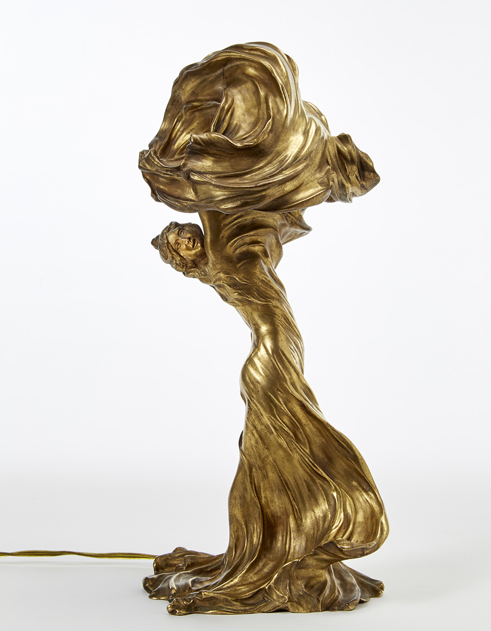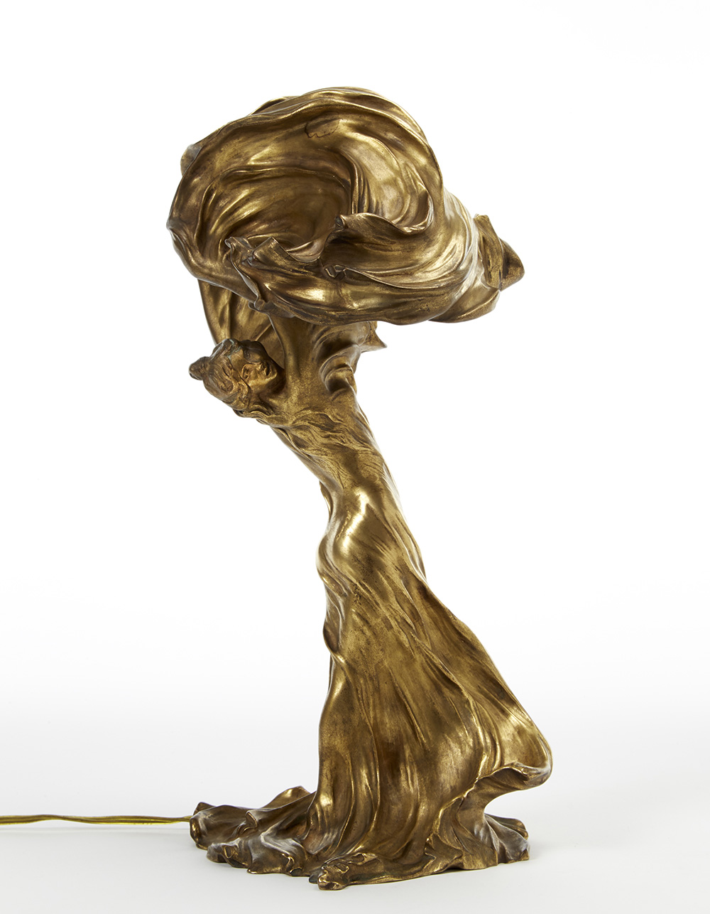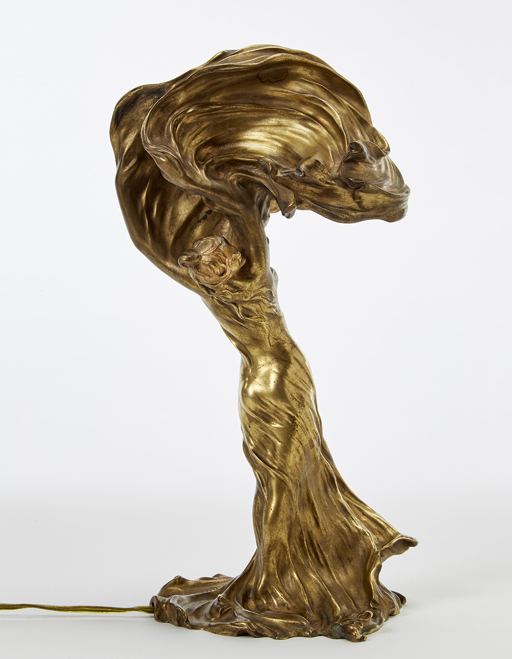 Lampada-scultura da tavolo in fusione di bronzo. Parigi, 1900. Firmata al piede "RAUL LARCHE", recante il timbro di fonderia " Siot Fondeur Paris" e numerata a incussione 1938. (h cm 32,5)