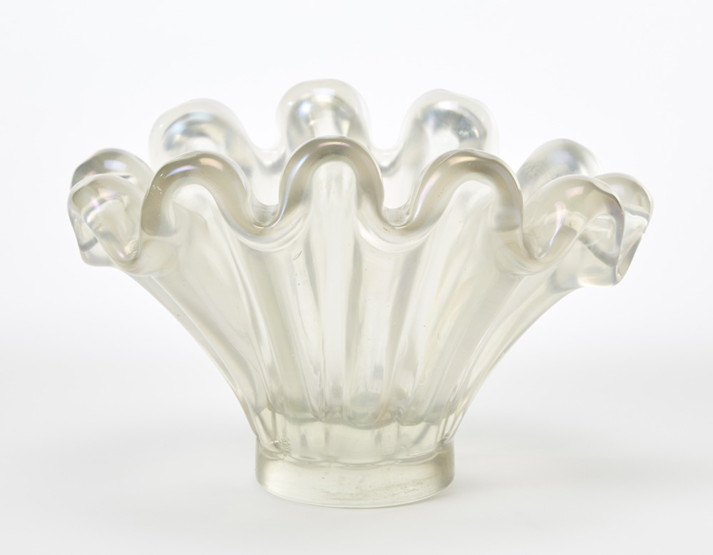 Vaso a conchiglia della serie "a grosse costolature". Esecuzione Barovier & Toso, Murano, anni '30. Vetro massello incolore fortemente iridato sulla superficie esterna. Firmato all'acido sotto la base "barovier toso murano". (cm 37x24,5x23,5) (difetti)