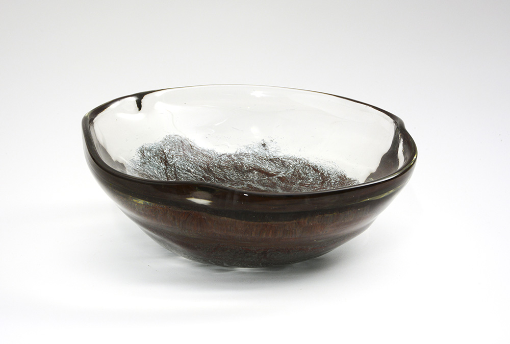 Coppa della serie "Grovigli". Venini, Murano, anni '60. Vetro sommerso trasparente incolore con inclusione senza fusione di filamenti di rame. (h cm 12; d cm 30,5) (lievi difetti)