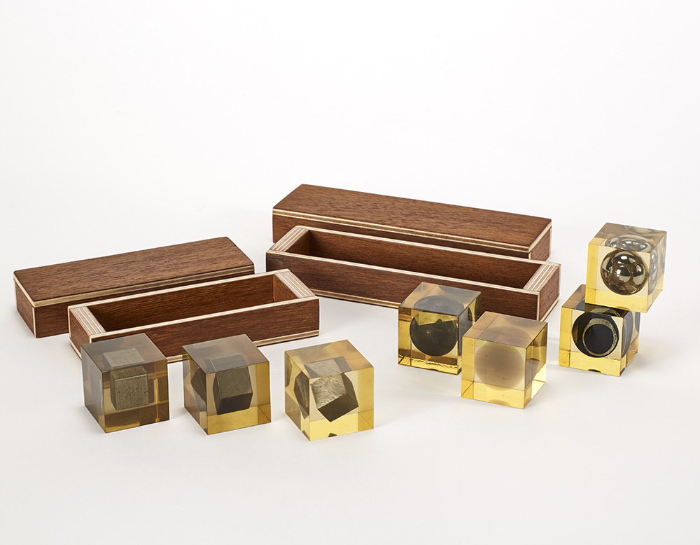 Two series of 4 and 3 resin cubes containing respectively 4 spheres each of different material and 3 metal cubes in different positions. In two not original wooden boxes. Produced by Danese, Milan, 1959-1963. Unnumbered multiples. (Cubes cm 4x4x4; boxes 15x5x5.5 cm)